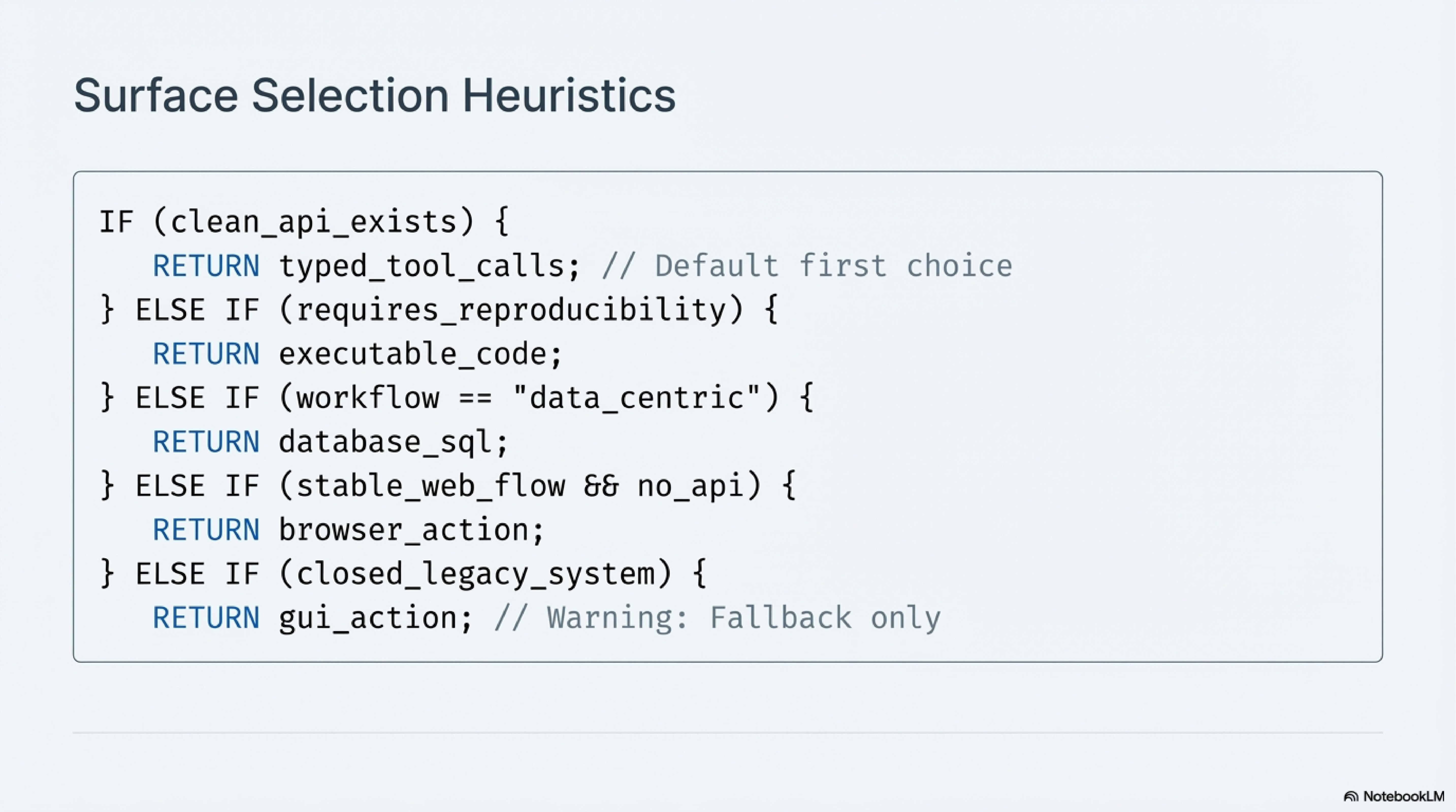 This is also where the choice of action surface starts to matter more than many teams expect. If a clean API exists, that is usually the best place to begin because the environment already exposes a contract designed for machines. Code is the right surface when the task needs reproducibility, transformation, or testable logic. SQL belongs here as well, especially in enterprise work, because many high-value tasks are really structured data questions wearing the costume of general intelligence. Browser action enters only when the system that matters exposes no usable interface beyond the web itself. GUI action sits even farther out at the edge, where the software world has given the agent nothing but pixels, visual ambiguity, and shifting layouts.