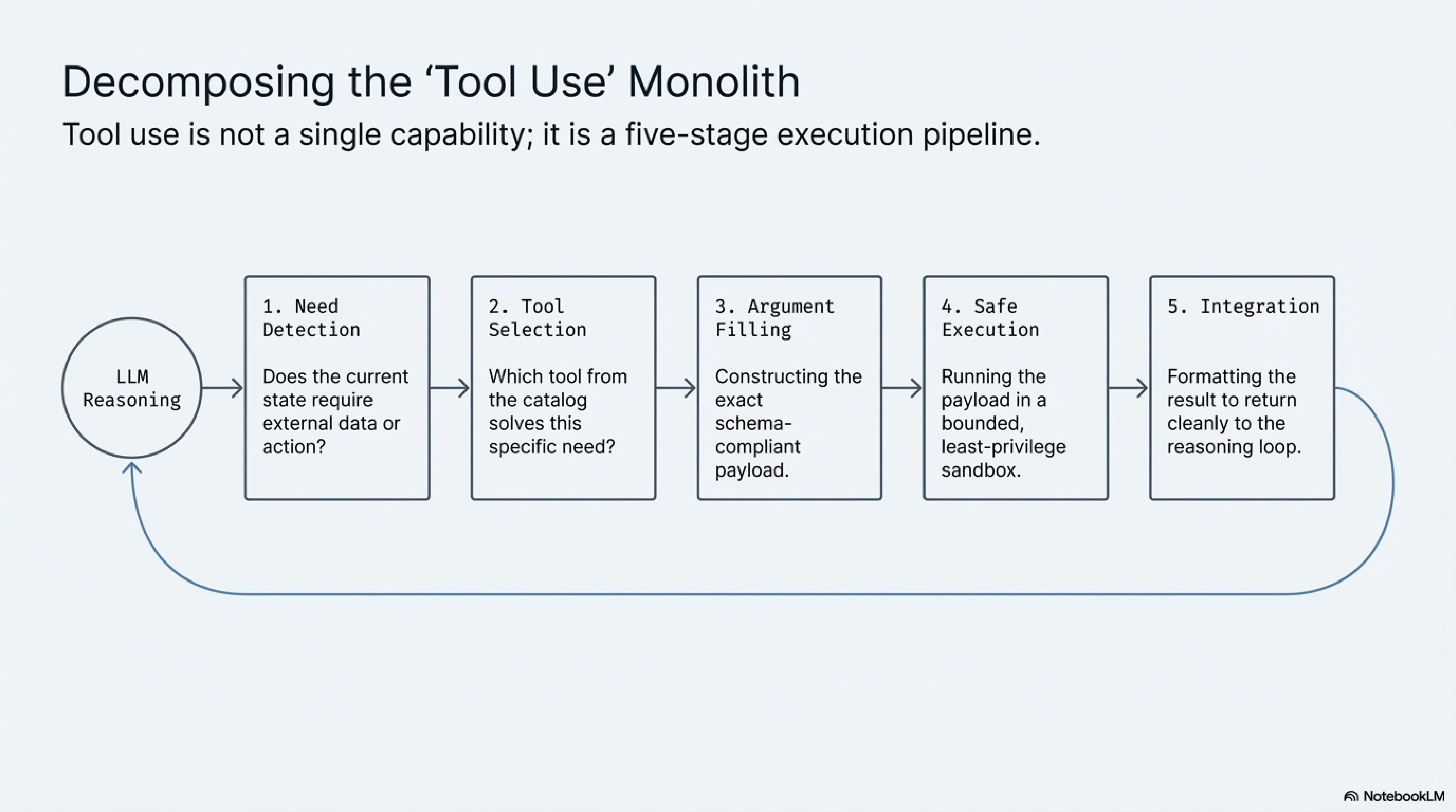 The first seam is tool need detection. A model has to recognize that the answer is not already inside its static training distribution and that live state is required. This sounds obvious until you watch a system bluff. Ask for a flight next Tuesday, a current balance, or a production metric, and the model has to suspend the impulse to answer from plausibility. It has to reach the colder conclusion that the right next step is not another sentence but an external call. A surprising amount of fragility begins here, because a system that fails to notice the need for action never reaches the rest of the pipeline.