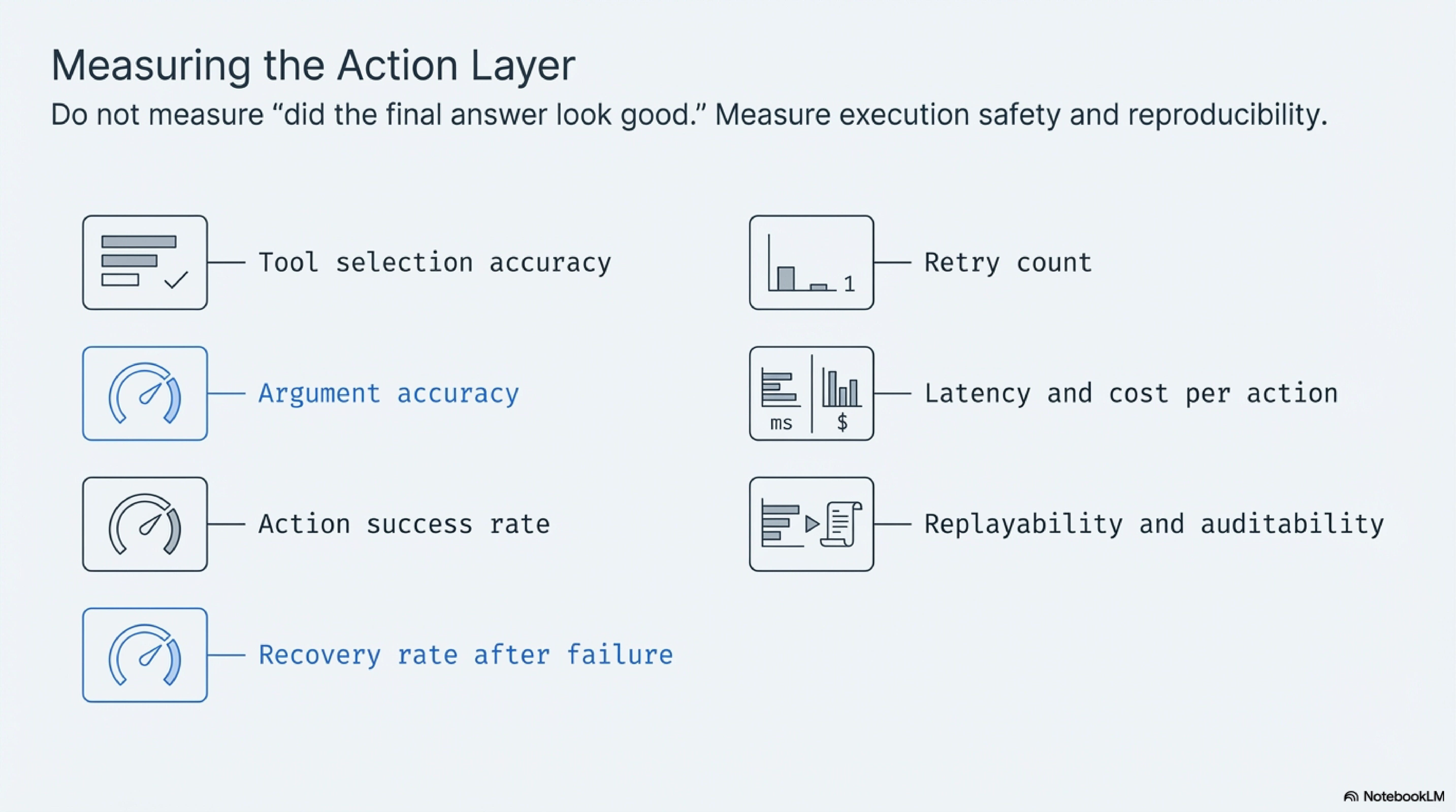 Seen together, these seams explain why action systems have such a different feel from ordinary chatbot evaluation. The public tends to judge by surface confidence. Did the final answer look coherent. Did the system sound sure of itself. Did the demo keep moving. Builders cannot afford that luxury. They need to know whether the right tool was chosen, whether the arguments were valid on the first try, whether execution succeeded safely, whether recovery happened after failure, and whether the entire sequence can be replayed after the fact. The unit of trust is no longer the paragraph. It is the action trace.
