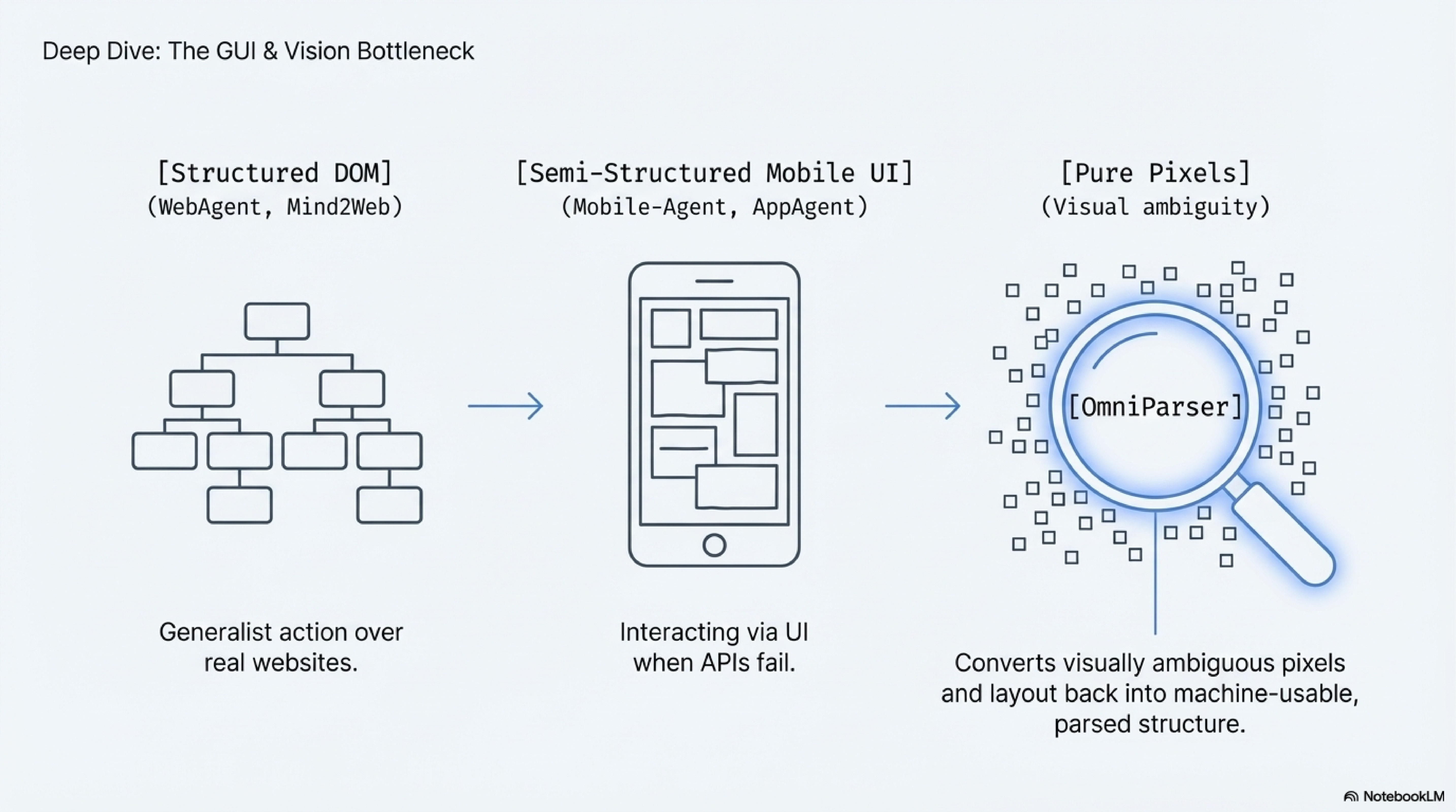 OmniParser for Pure Vision Based GUI Agent is the cleanest reference for the GUI perception bottleneck. Its key contribution is not proving that computer use is solved, but isolating the parsing problem that stands between screenshots and usable machine structure. That matters here because the essay's warning about GUI action rests on exactly this point: pixels are a weak contract unless another layer reconstructs the structure machines need.