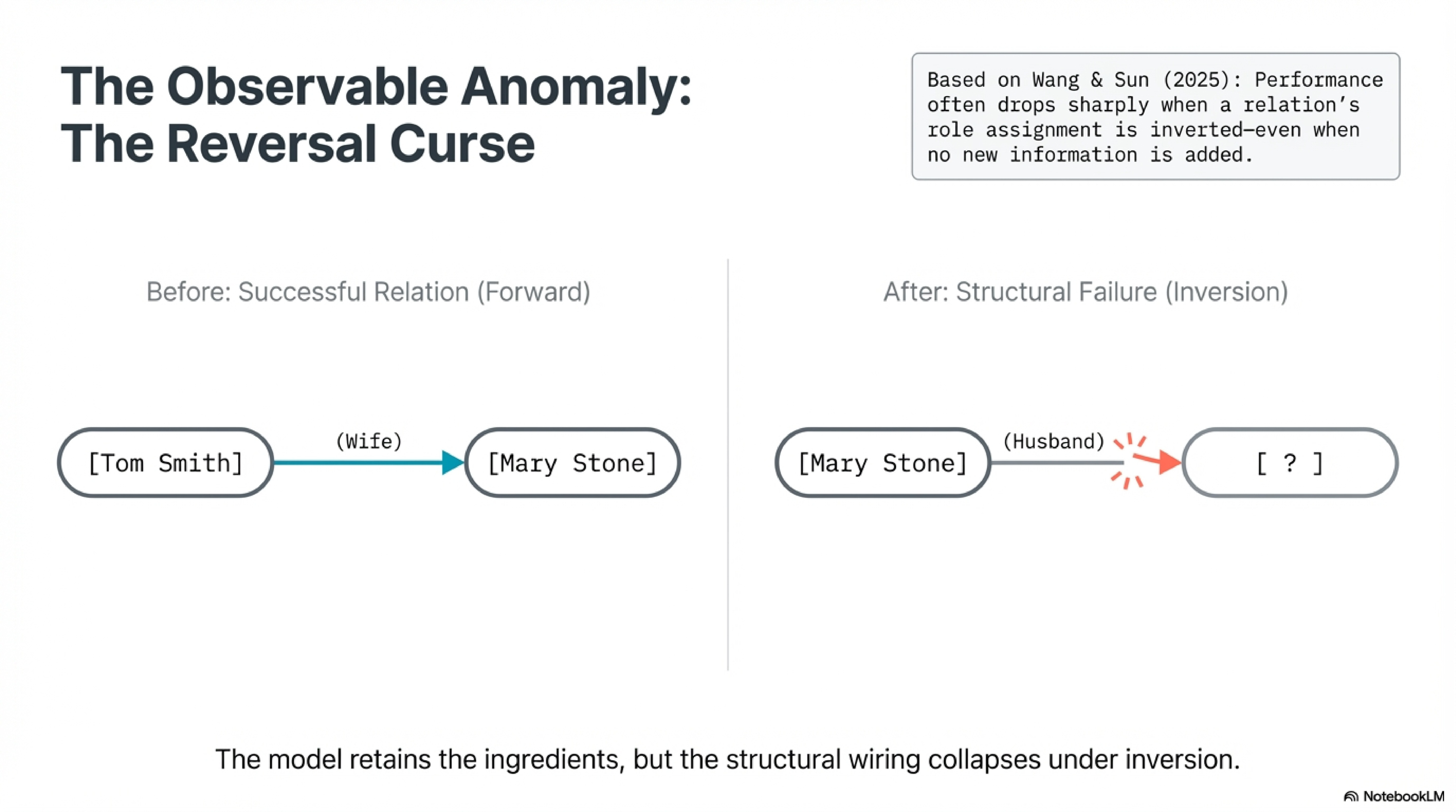 Tell a language model that Tom Smith's wife is Mary Stone. Then ask who Mary Stone's husband is. Nothing new has been added. The same pair is still in play, the same relation, the same world. Yet performance often drops sharply. Boshi Wang and Huan Sun use this Reversal Curse to show something more serious than a missing benchmark skill. Current transformer models can retain the ingredients of a fact while failing to keep the relation in a form that survives a change in role assignment. The names remain available. The relation remains familiar. What gives way is the attachment that tells the system which entity belongs in which slot. The words survive. The binding does not.