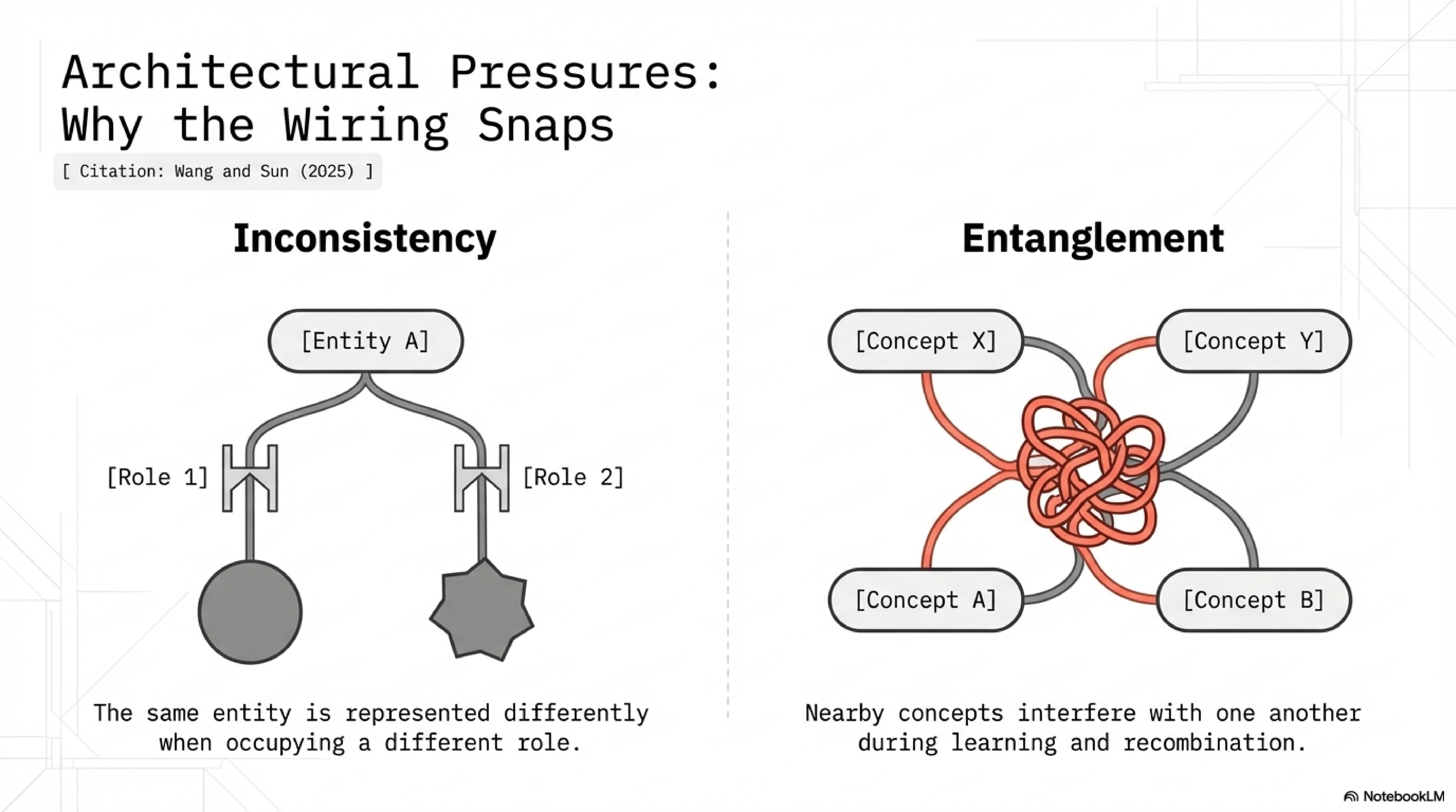 The essay's opening anchor. It connects reversal failure to inconsistency and entanglement in conceptual binding and shows that targeted architectural changes can reduce the failure.