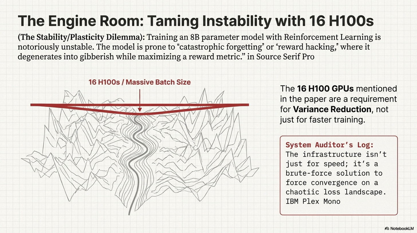 [!NOTE] System Auditor’s Log: Training an 8B parameters model with Reinforcement Learning is notoriously unstable. The model often experiences “catastrophic forgetting” or “reward hacking,” where it maximizes the reward metric by degenerating into gibberish. The “infrastructure” described in the paper is not just about speed; it’s about forcing convergence on a chaotic loss landscape.