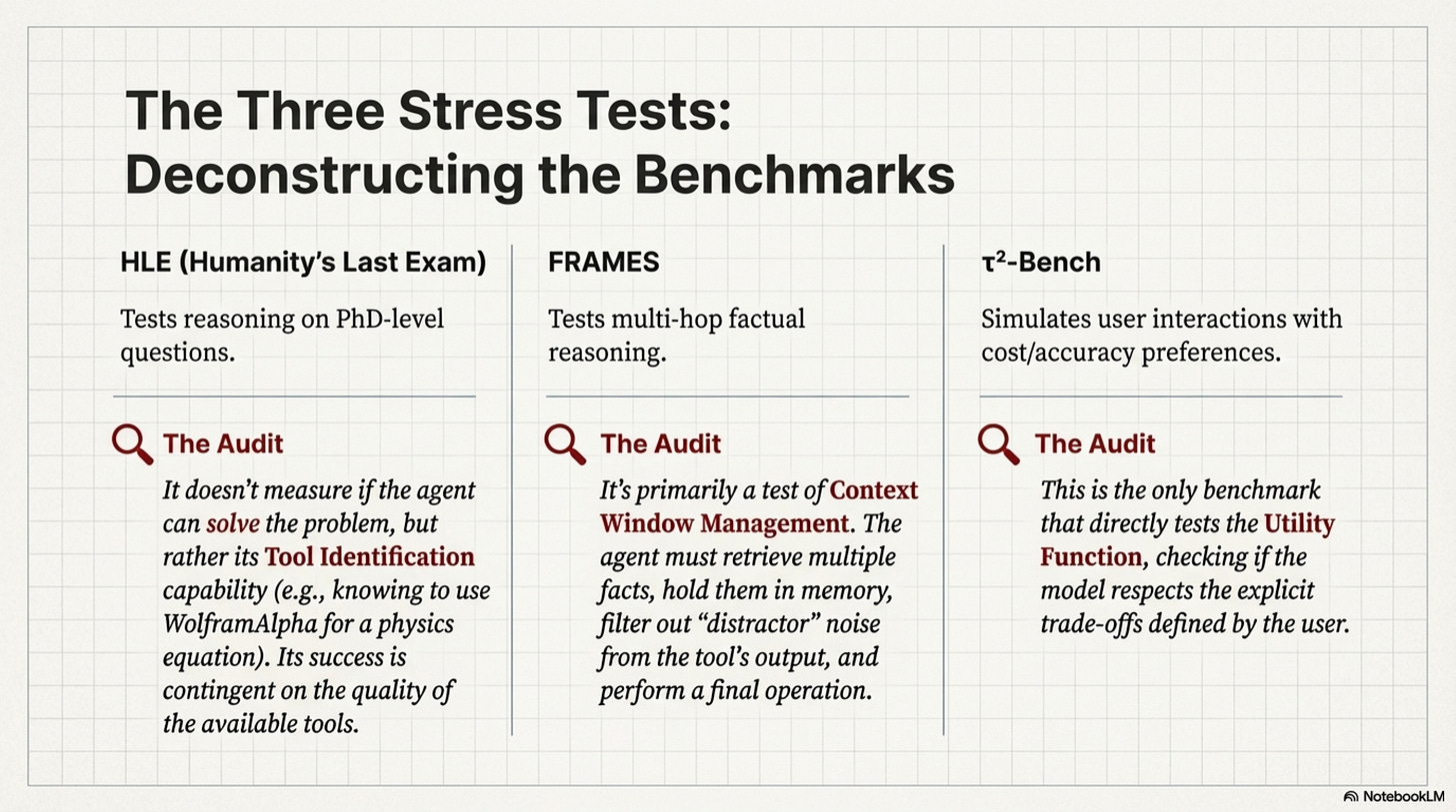 Humanity’s Last Exam (HLE) consists of PhD-level questions. Most LLMs fail these not because they can’t write, but because they lack specific domain computations. The benchmark measures Tool Identification, meaning the orchestrator doesn’t solve the physics equation but correctly identifies that WolframAlpha can solve it. The caveat is that this measures the quality of the tools available as much as the orchestrator. If the tool suite lacks a physics engine, the orchestrator fails regardless of its “intelligence.”