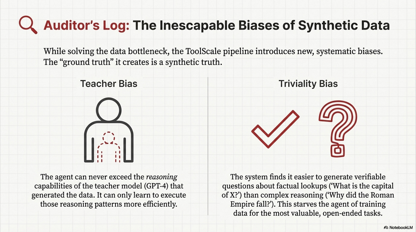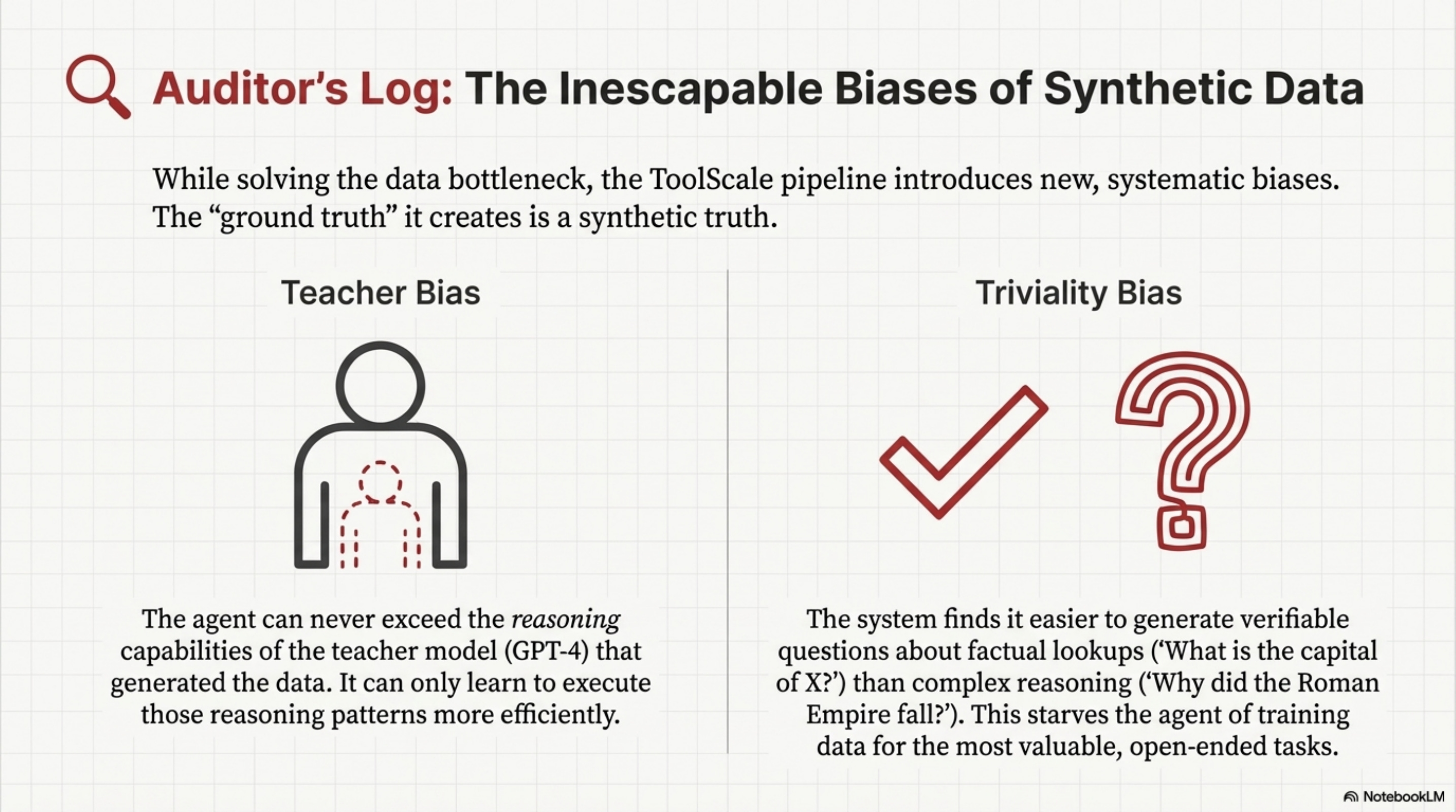 First, there is Teacher Bias, meaning the orchestrator can never exceed the reasoning capabilities of the teacher model (GPT-4) that generated the trajectories; it can only become more efficient at executing them. Second, there is Triviality Bias. It is easier to generate verifiable questions about “lookups” (What is the capital of X?) than about “reasoning” (Why did the Roman Empire fall?). This pushes the dataset towards factual retrieval, potentially under-training the “complex reasoning” circuits. The “verifiable ground truth” is a gold standard, but it constrains the domain to problems with singular, verifiable answers. Ambiguous, open-ended tasks, which are often the most valuable, are systematically filtered out.