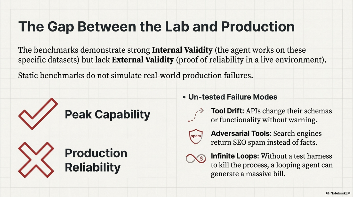 However, these datasets are static and do not simulate Tool Drift (APIs changing their schema), Adversarial Tools (search engines returning SEO spam), or Infinite Loops (the benchmark harness strictly cuts off execution after N turns). In production, there is no harness. A model that enters a loop creates a $10,000 bill. The benchmarks measure “Peak Capability,” not “Production Reliability.”