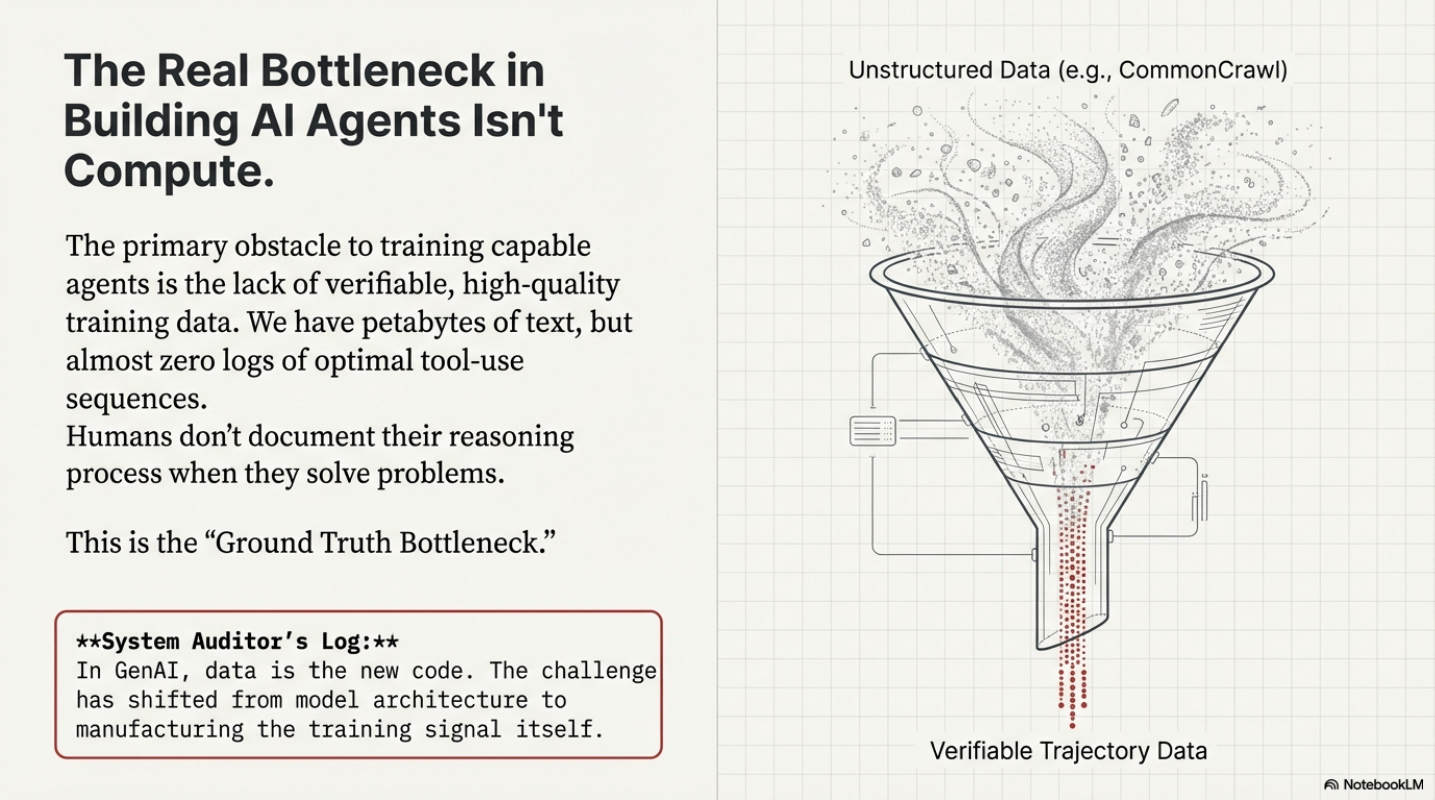 [!NOTE] System Auditor’s Log: In GenAI, data is the new code. The biggest bottleneck for training agents is not compute; it’s the lack of verifiable trajectory data. We have petabytes of text (CommonCrawl), but almost zero logs of “optimal” tool use sequences. Humans don’t write down their thought processes when they use Google.