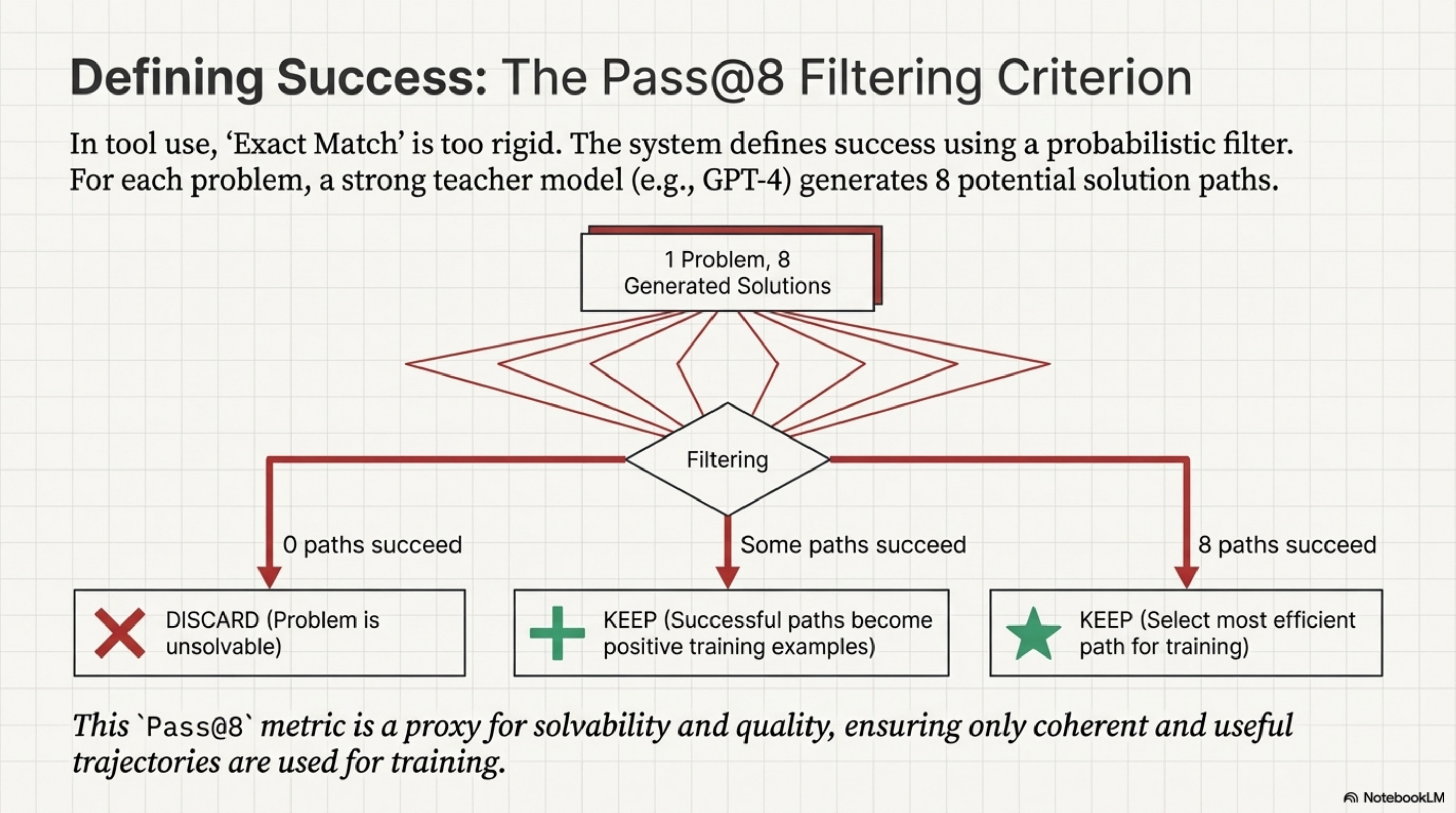 The critical innovation, and the potential flaw, is in how they define “success.” In standard supervised learning, we measure Exact Match to see if the model output the exact string we expected. In tool use, this is too rigid because there are many ways to query a database.