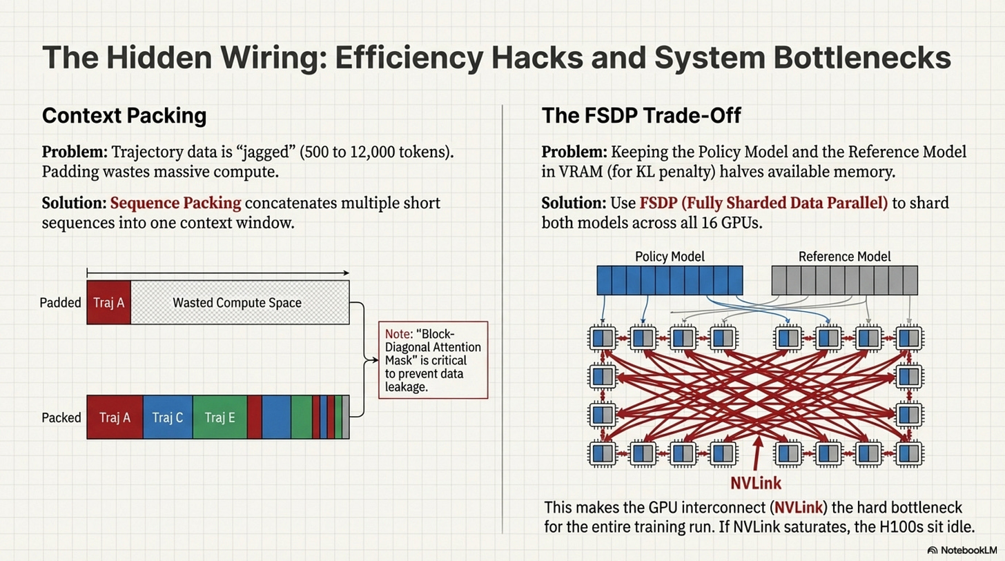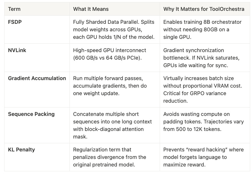 The Reference Model (the frozen copy) must be kept in VRAM to compute the KL divergence penalty, effectively halving the available memory for training. This forces a trade-off: offload the Reference Model to save VRAM but kill throughput via the PCIe bottleneck, or keep it in VRAM for fast training but limit batch size (increasing variance). ToolOrchestra chooses FSDP (Fully Sharded Data Parallel) to shard both models across the 16 GPUs. This implies that the network interconnect (NVLink) is the hard bottleneck of the entire training run. If NVLink is saturated, those H100s sit idle.