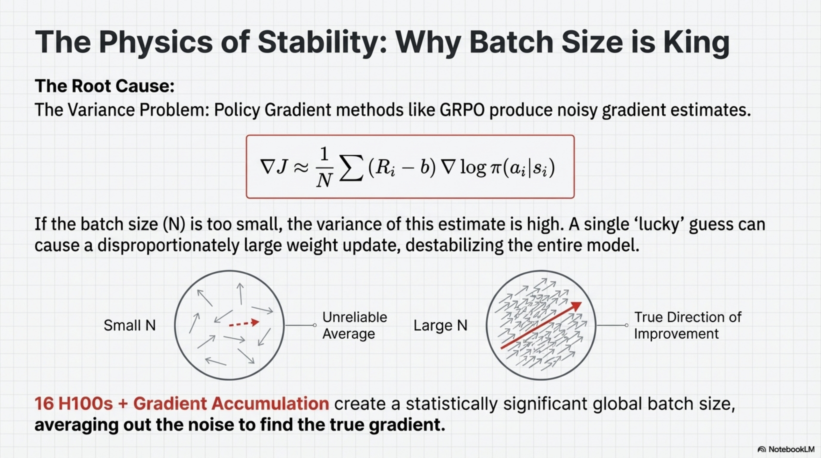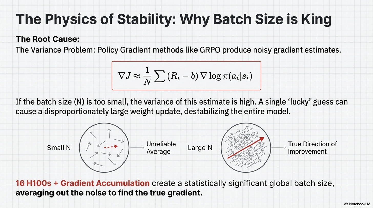 In Policy Gradient methods (like GRPO), the gradient estimate is noisy. If the batch size is small, the variance of this estimate is high. One “lucky” random rollout where the model guesses the right answer can trigger a massive weight update, pushing the model into a region of the parameter space that ruins its general capabilities. To stabilize this, you need a massive batch size to average over hundreds of trajectories and find the “true” direction of improvement. The 16 H100s allow for a global batch size that is statistically significant, and Gradient Accumulation further virtually increases this batch size.