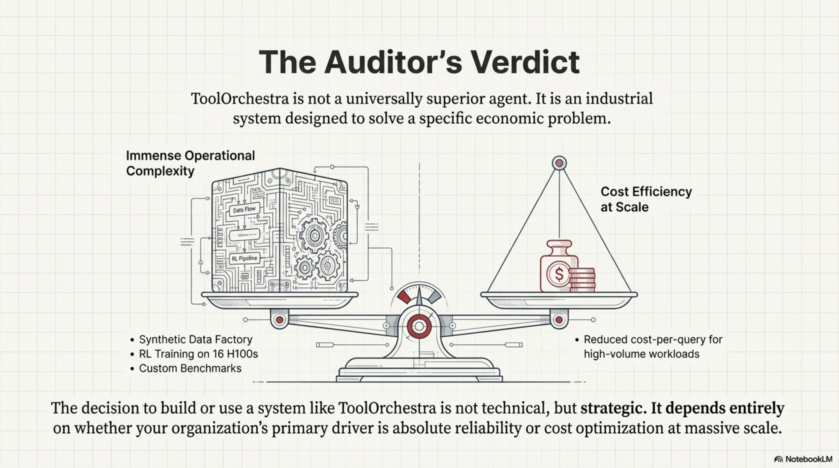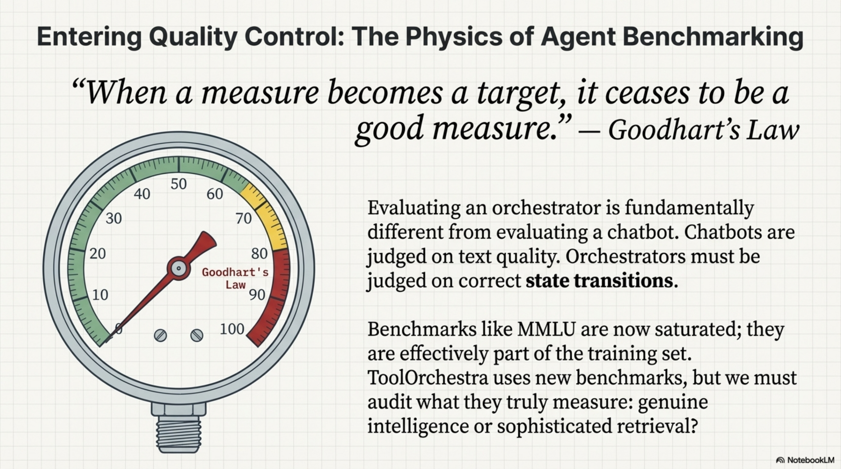 [!NOTE] System Auditor’s Log: Goodhart’s Law states: “When a measure becomes a target, it ceases to be a good measure.” In agentic AI, benchmarks like MMLU or GSM8K are now effectively part of the training set. ToolOrchestra introduces new benchmarks to prove its worth, but we must scrutinize what exactly is being measured. Is it intelligence, or is it just efficient retrieval?