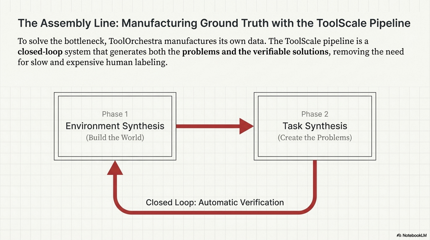 This Part dissects ToolScale, the synthetic data pipeline used to train ToolOrchestra. It attempts to solve the “Ground Truth Bottleneck,” the fact that we don’t know the optimal way to solve most problems. Use of human labeling is too expensive and slow, while wild data is too noisy. The authors must manufacture data.