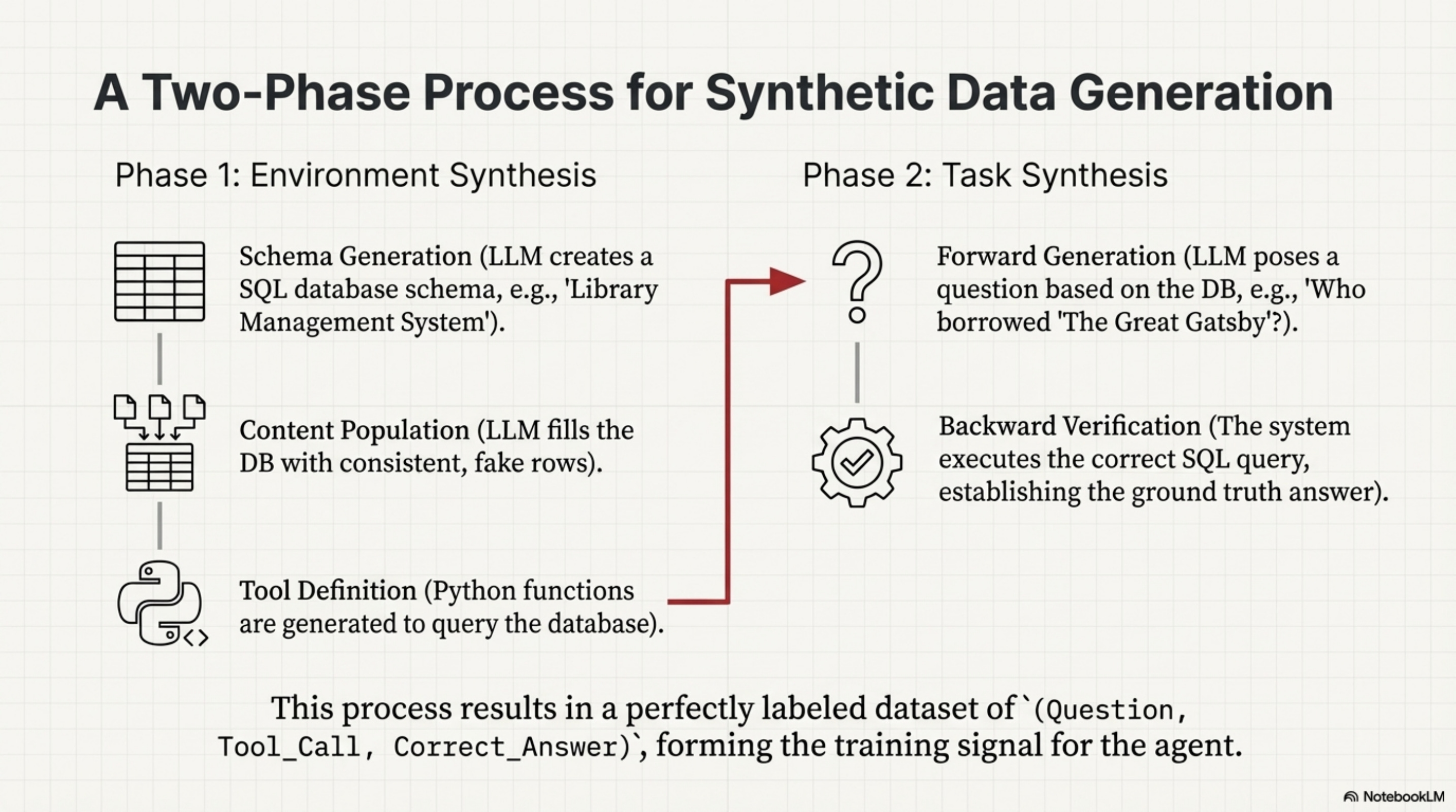 Then, in Phase 2 (Task Synthesis), they generate the “problems.” An LLM looks at the database and asks a question like “Who borrowed ‘The Great Gatsby’?” Because the database was synthesized, the system knows the answer. It can execute the SQL query to get the ground truth. This creates a labeled dataset of (Question, Tool_Call, Correct_Answer) pairs. Because the environment is synthetic, the system knows the ground truth, enabling automatic verification at scale without human labelers.