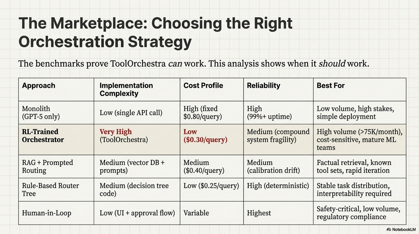 ToolOrchestra’s learned routing trades operational complexity for cost efficiency. Rule-based routers achieve similar cost savings without RL training, but lack adaptability. RAG+Prompting is the “middle ground” for teams without ML infrastructure, and monoliths remain optimal when reliability matters more than cost. The benchmarks prove ToolOrchestra can work; this table shows when it should work.