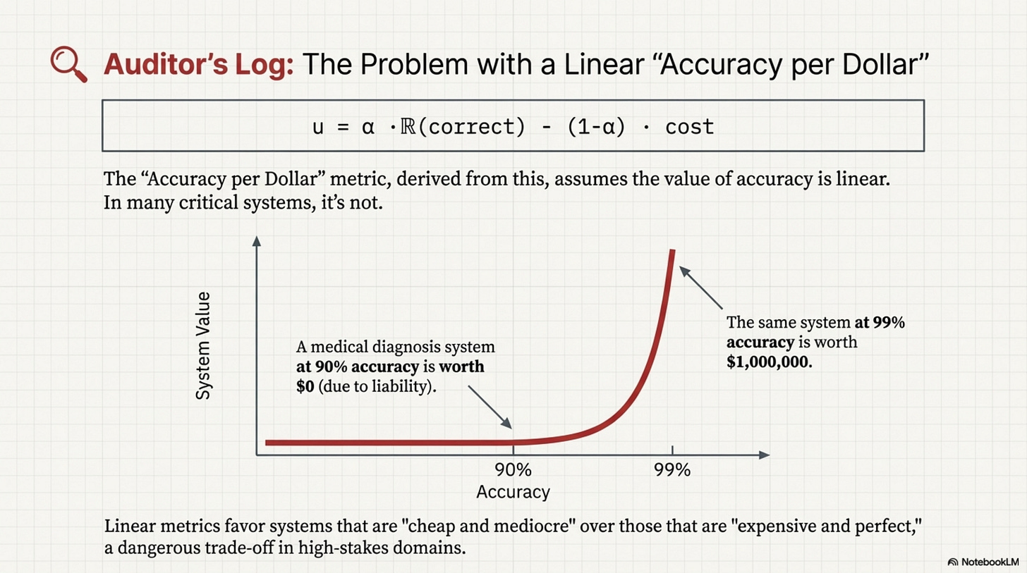 In many production systems, the value of accuracy is non-linear. For example, 99% accuracy on a medical diagnosis task is worth $1M, while 90% accuracy is worth $0 (or negative, due to liability). A linear “Accuracy per Dollar” metric favors systems that are “cheap and mediocre” over systems that are “expensive and perfect.”