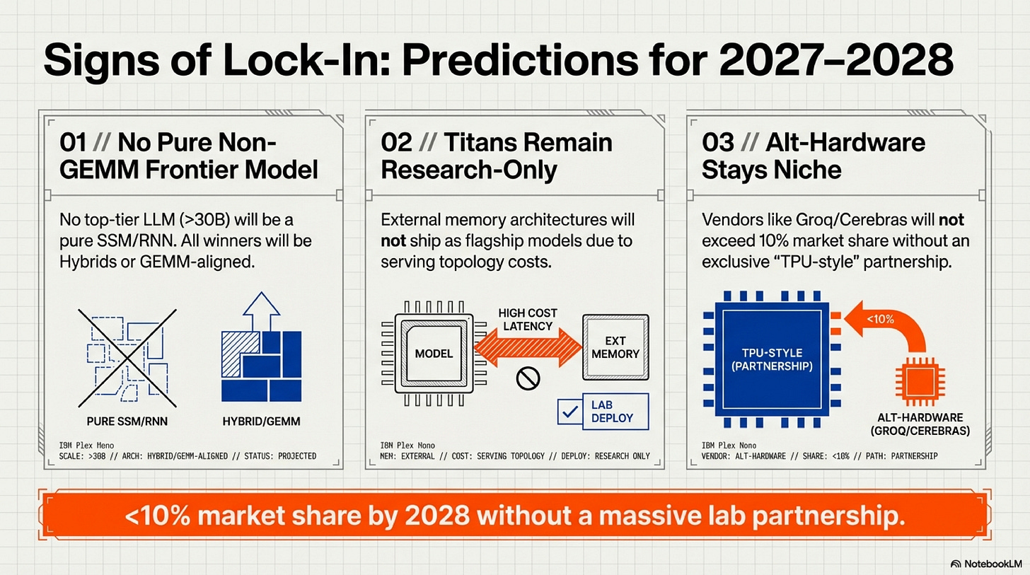 Architectures requiring explicit external memory modules (à la Titans, 2024) will not ship as flagship frontier models until dedicated hardware support emerges. The serving topology changes are too severe for current infrastructure.