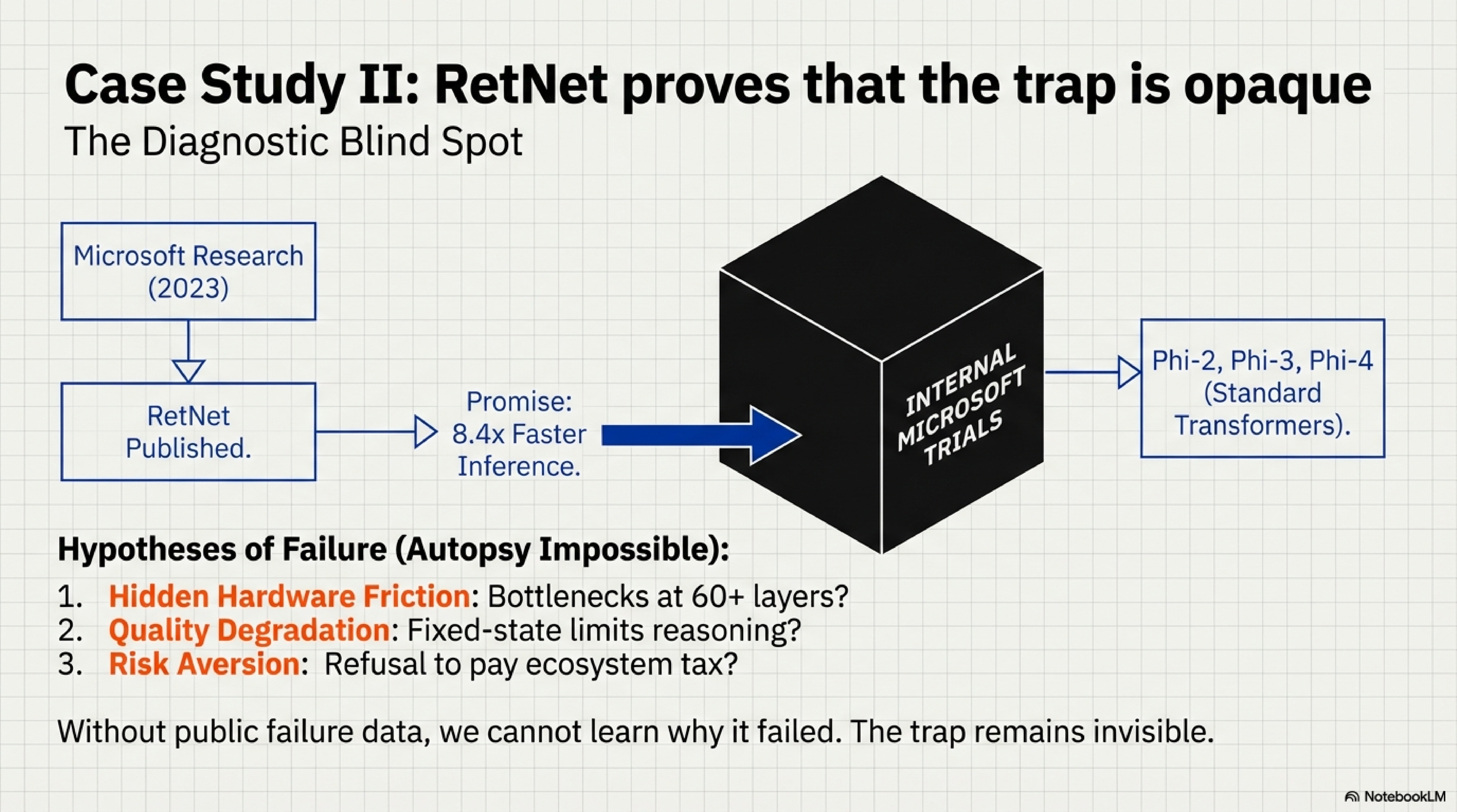 RetNet is the most revealing case study—not because it succeeded, but because we cannot determine which gate killed it.