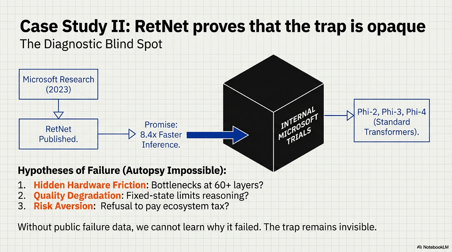 RetNet is not evidence that the two-gate framework fails. It is evidence that the trap is opaque. Architectures can fail silently behind closed doors, and without access to internal scaling experiments, we cannot perform the autopsy. The two-gate framework is predictive at the boundaries (pure scan-based models fail Gate 1; architectures without institutional backing fail Gate 2) but struggles in the middle where hardware and institutional factors entangle.
