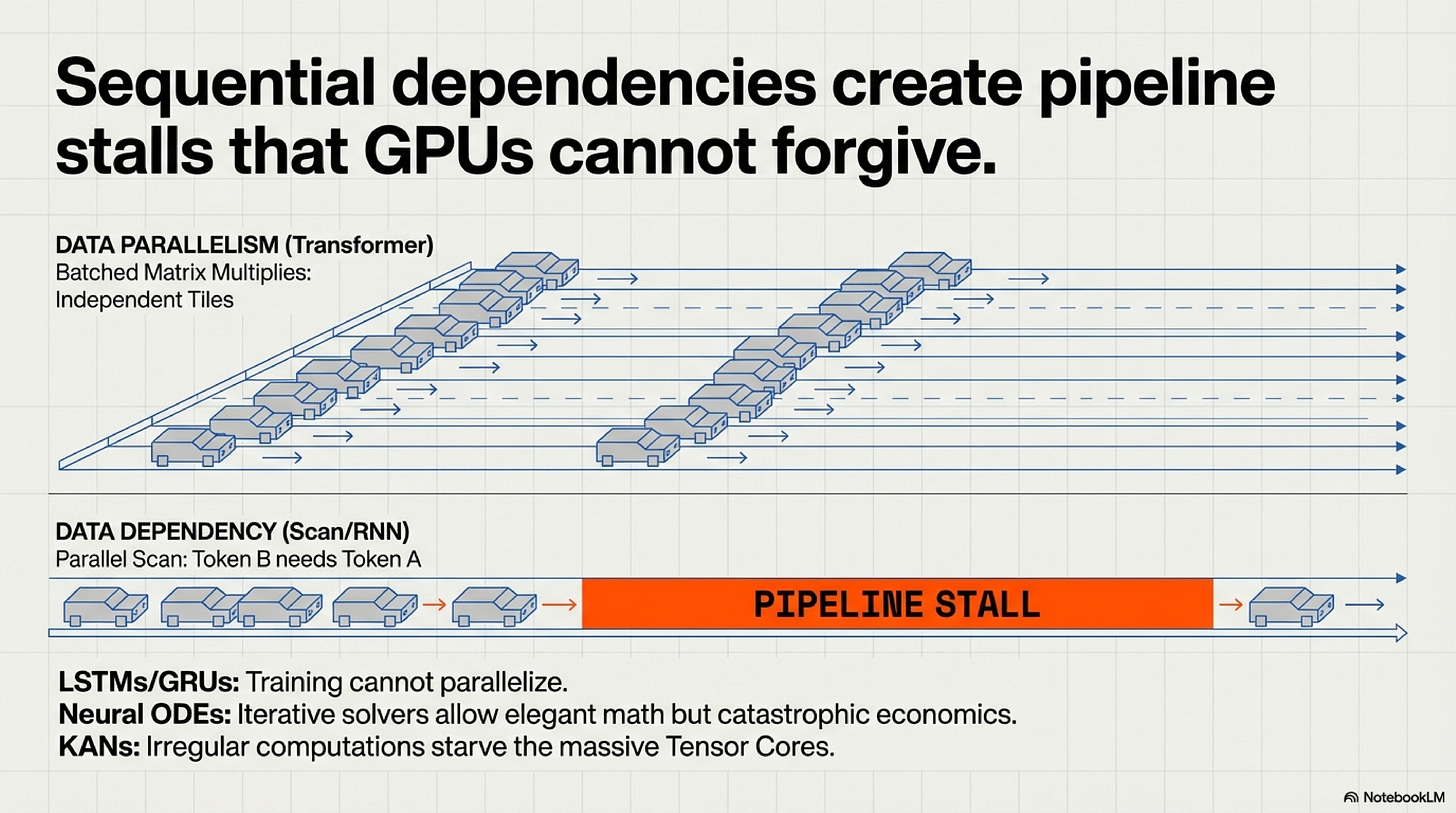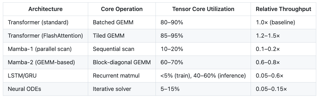 This is not a software limitation. It is a consequence of GPU architecture. Tensor Cores are designed for data-parallel operations on independent matrix tiles. Scans are data-dependent: they serialize across the sequence dimension, creating pipeline stalls. Clever kernel engineering can mitigate the penalty—Mamba-2 achieved a 2–3× speedup over Mamba-1 by restructuring its recurrence as block-diagonal GEMMs—but cannot eliminate the fundamental mismatch.