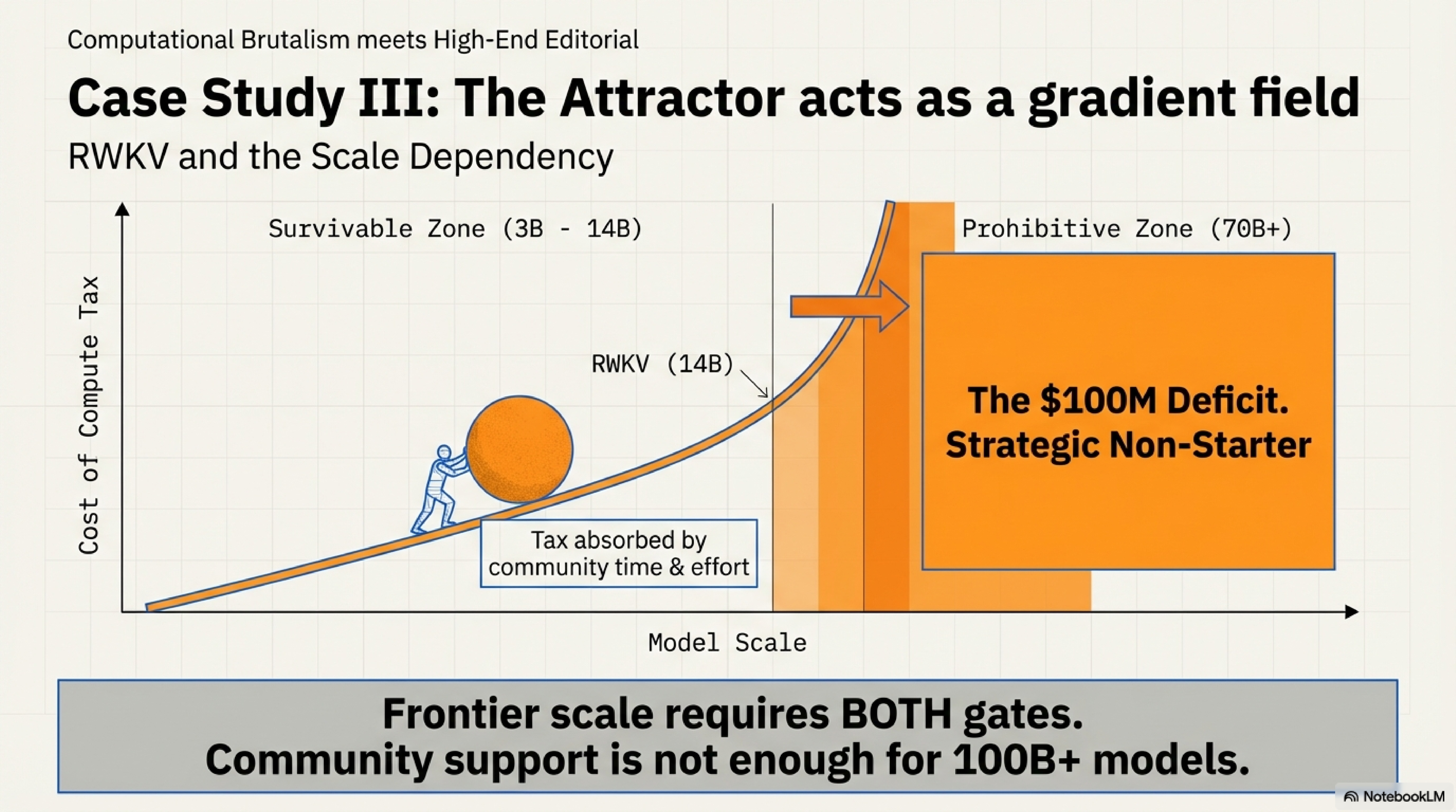The two gates don’t just reinforce each other—their interaction strengthens with scale. At 3B-14B, the compute tax is painful but survivable (maybe 2-3× longer training). At 70B-400B, the same tax becomes prohibitive: the difference between a $5M training run and a $15M one might be acceptable; the difference between $50M and $150M is a strategic non-starter.
