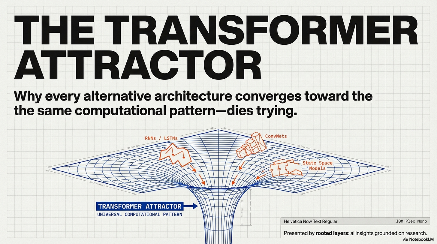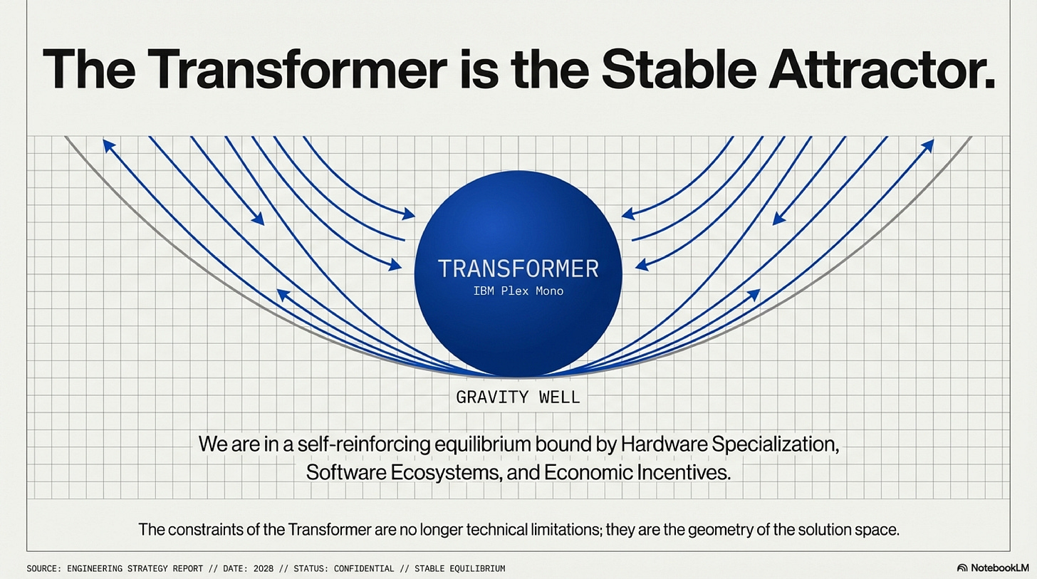 The Transformer is not the global optimum for neural computation. It is the stable attractor for architectures that must run economically on NVIDIA GPUs with institutional validation. And that attractor will continue to pull until either: