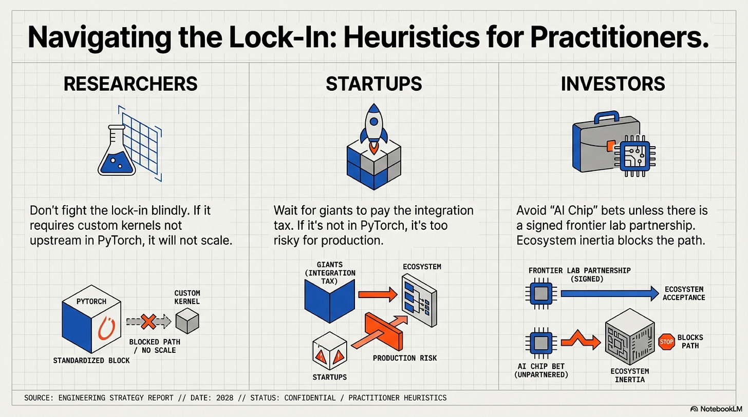 Heuristic: If your innovation requires custom CUDA kernels that are not upstream in PyTorch or JAX, it will not scale without significant institutional backing. Plan accordingly: either secure that backing early, or design your architecture to use standard primitives. Mamba-2 improved where Mamba-1 struggled because it moved toward GEMM alignment—but even that wasn’t enough without major lab adoption.