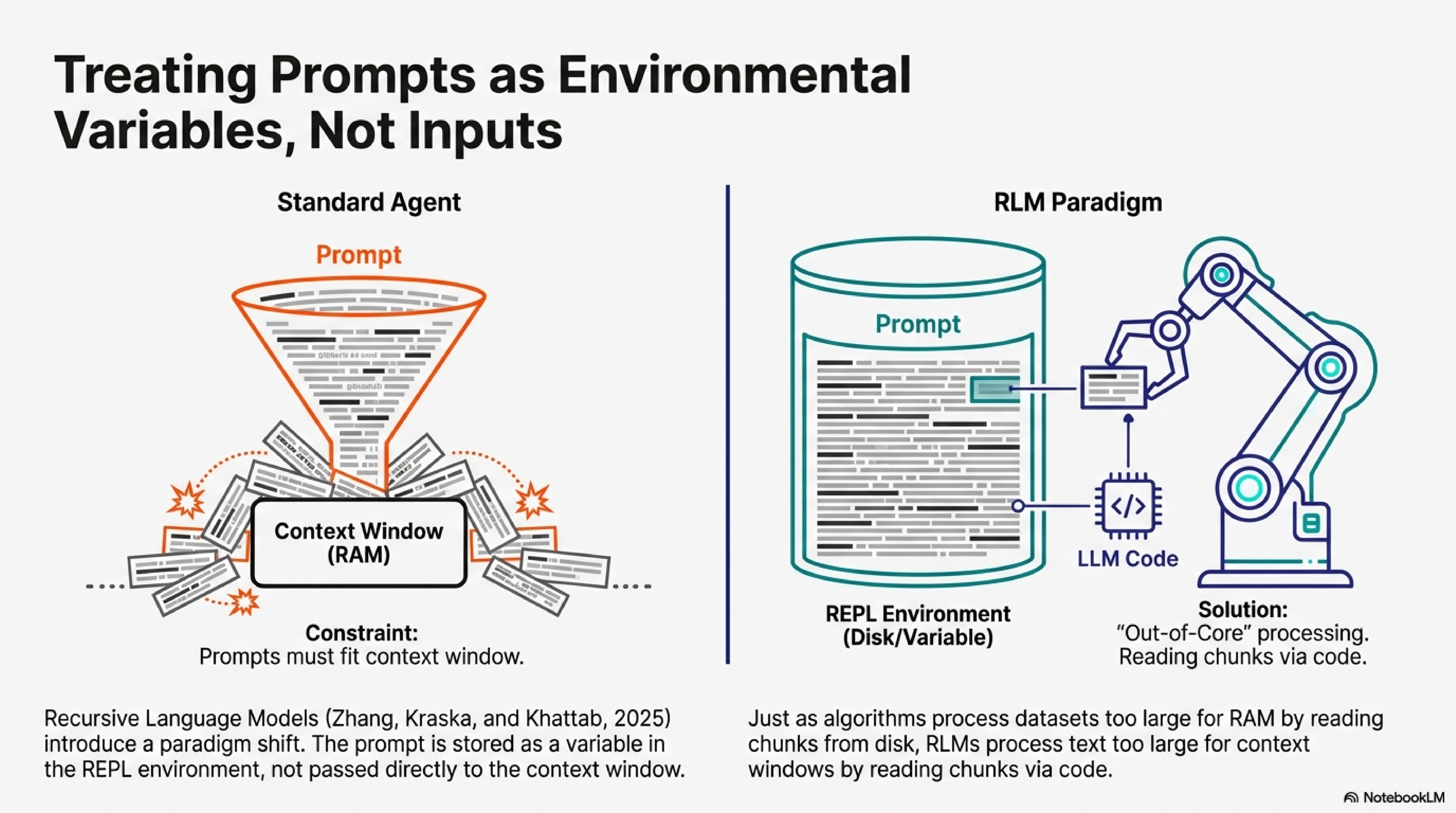 Long prompts should not be fed into the neural network directly. They should be treated as part of the environment that the LLM can symbolically interact with. This is the central insight of Recursive Language Models (Zhang, Kraska, and Khattab, 2025), and it changes what scaffolding can do.