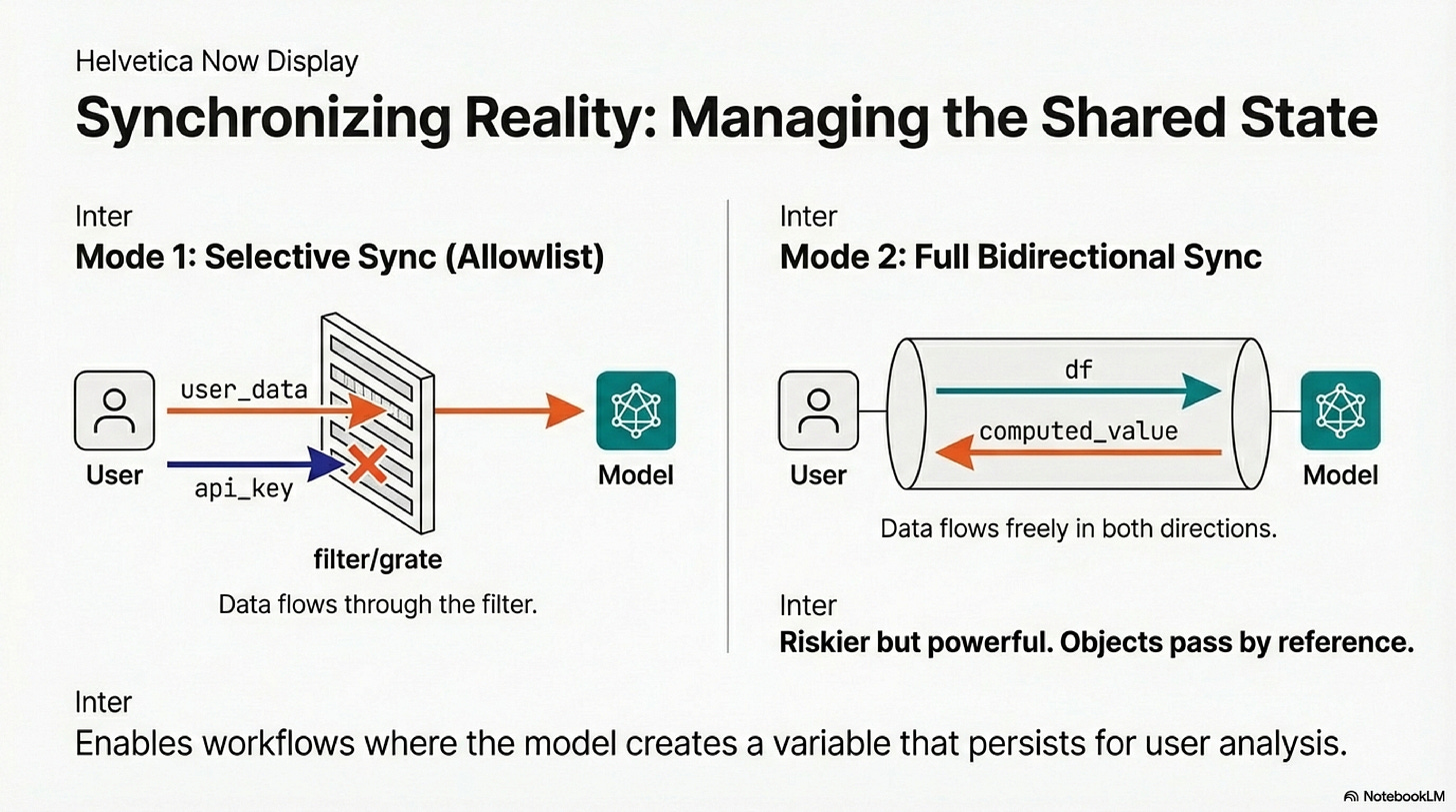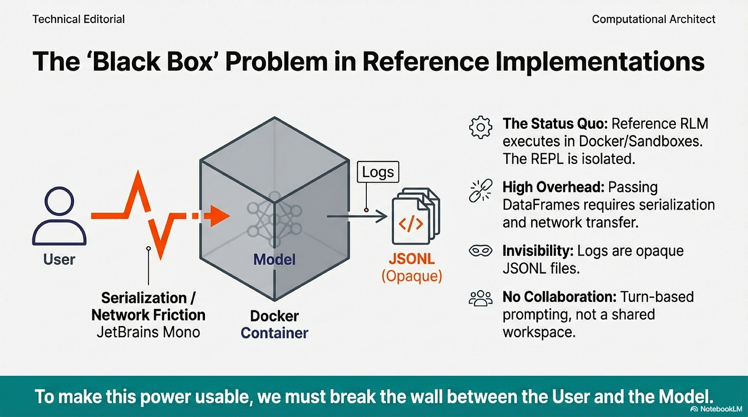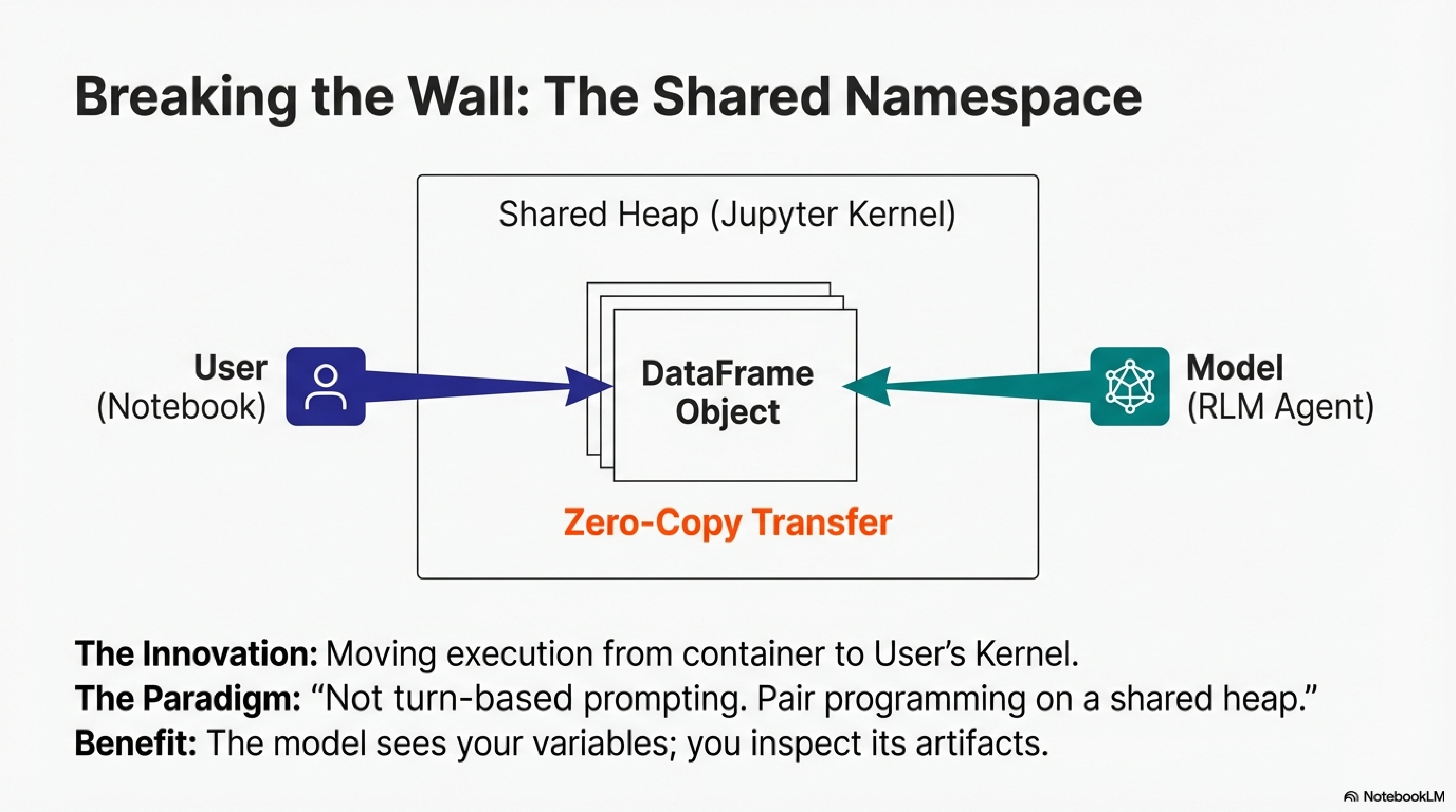 The friction of isolation is concrete. Passing large dataframes to a containerized RLM requires serialization, network transfer, and deserialization. For exploratory work where you run dozens of queries in an hour, that overhead accumulates. The notebook eliminates this boundary. Variables transfer without serialization. The model accesses data the user has defined; the user inspects artifacts the model has produced.