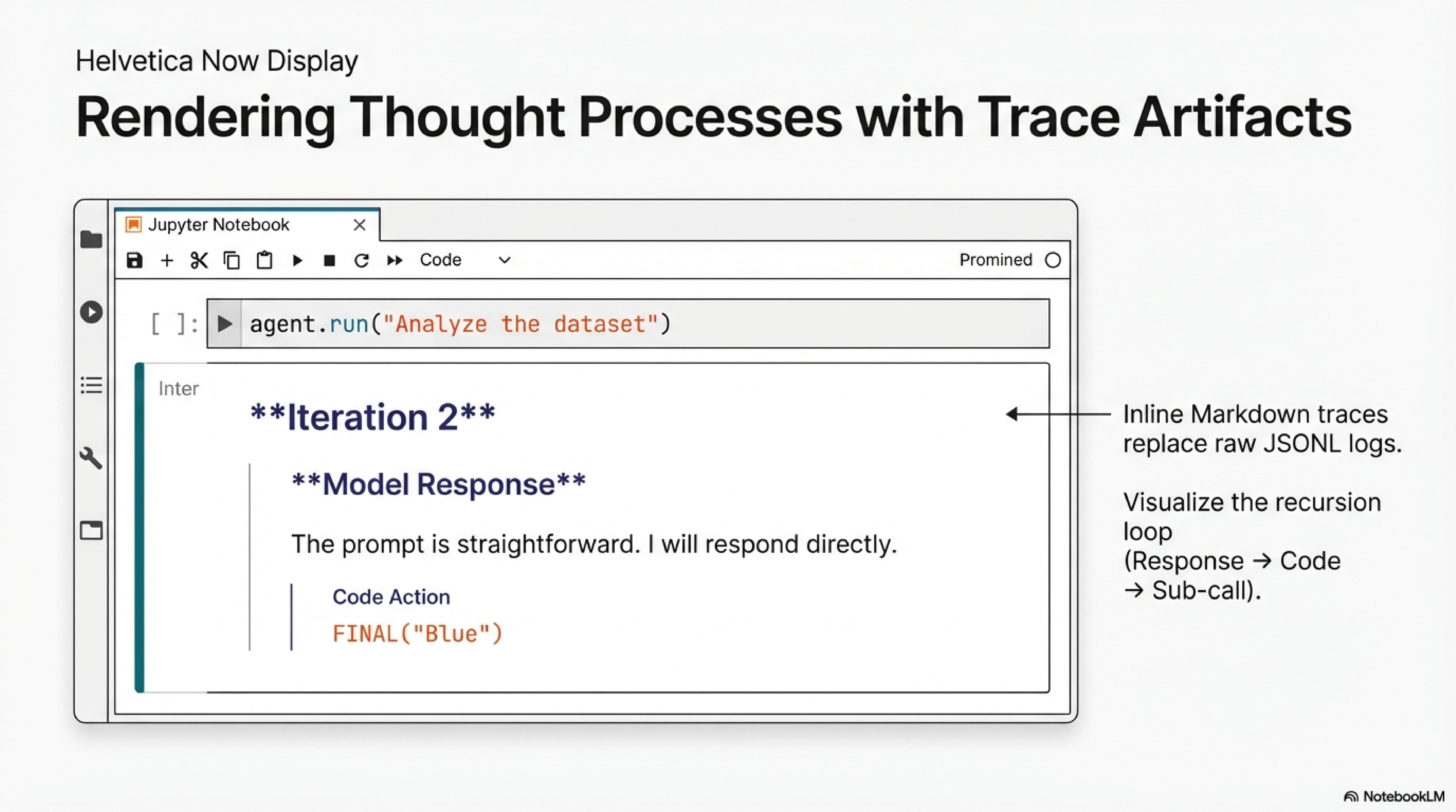 The prompt is straightforward. I will respond directly. FINAL(“Blue”) A second artifact is a runnable notebook generated from the JSONL log. A resume cell at the top rehydrates context variables and provides a replay map for sub-calls. Each iteration appears as markdown with the model's response, followed by executable code cells with captured outputs. You can step through the trajectory, modify intermediate cells, and resume from a corrected state.