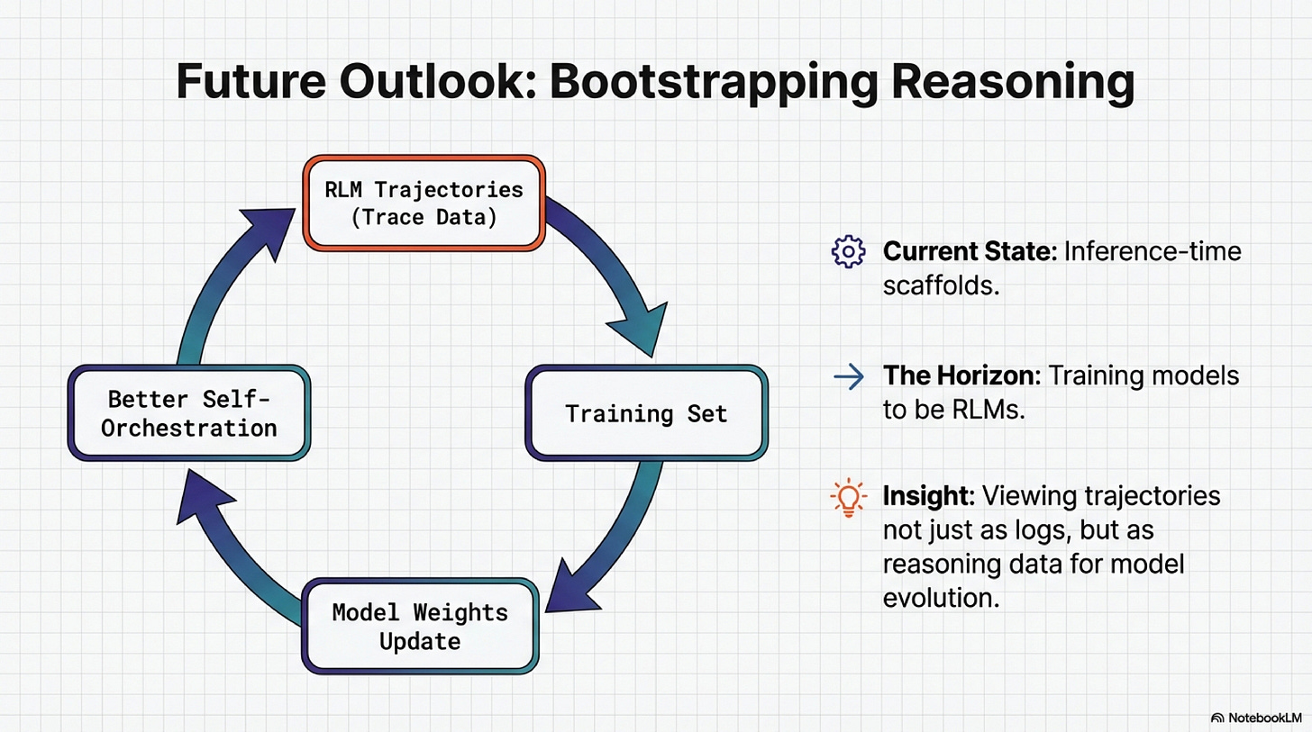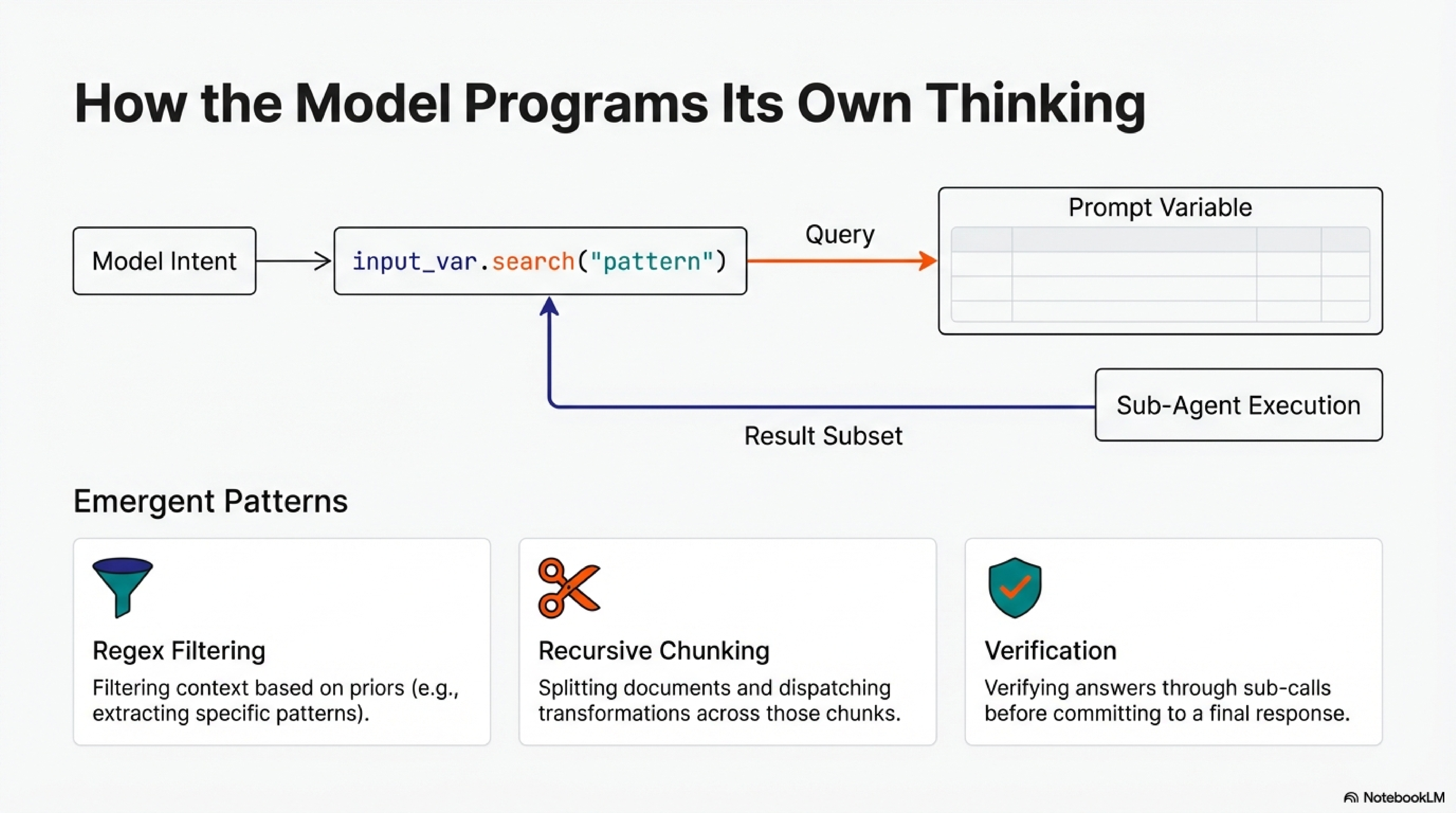 RLM trajectories are rich: model responses, code blocks, execution outputs, sub-LM calls. The paper documents patterns in these trajectories. Models filter input using regex based on priors. Models chunk contexts and dispatch recursive calls. Models verify answers through sub-calls before committing. These patterns are the substance of the paradigm.