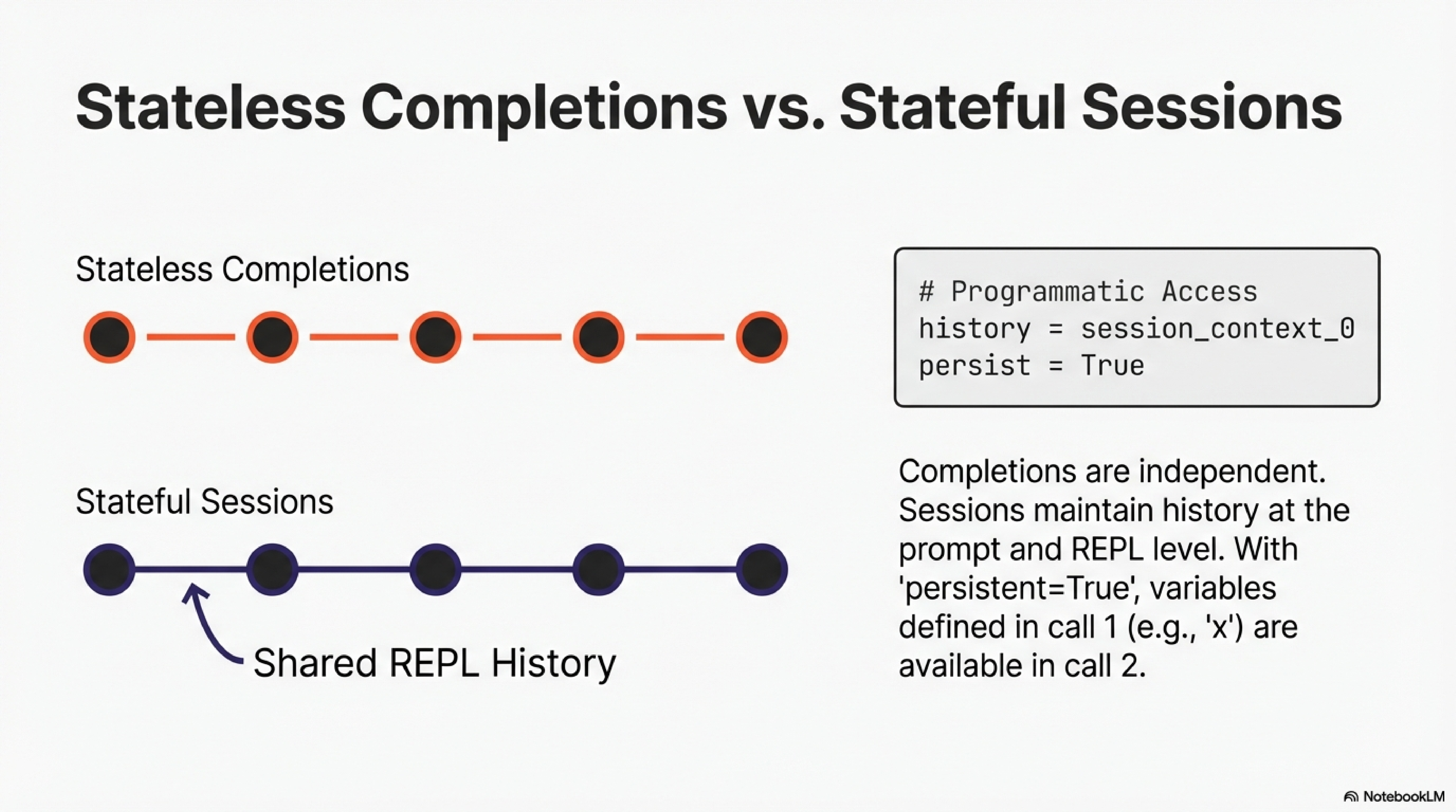 Completions are stateless: each call is independent. Sessions maintain history: each call sees accumulated context from prior turns.