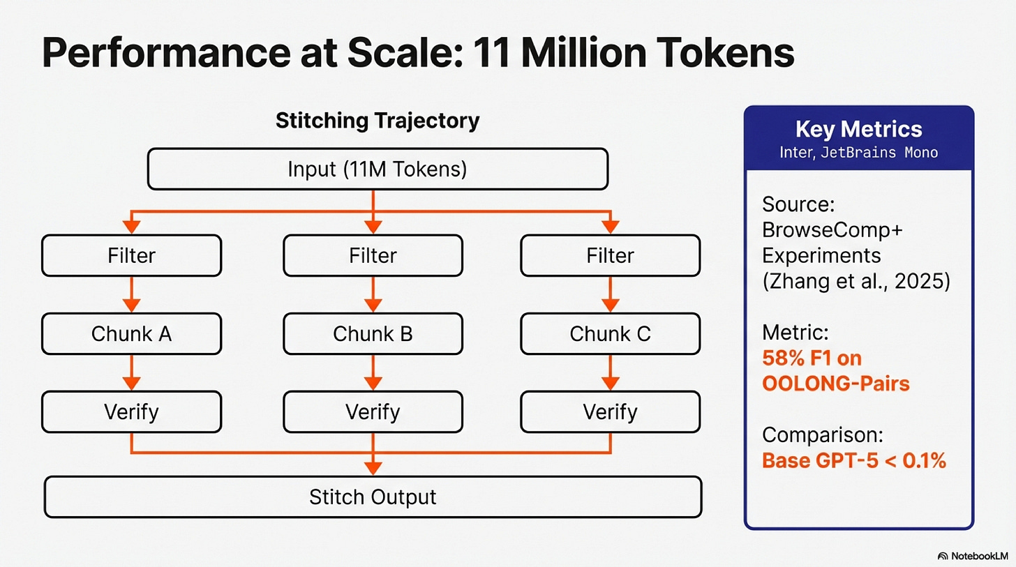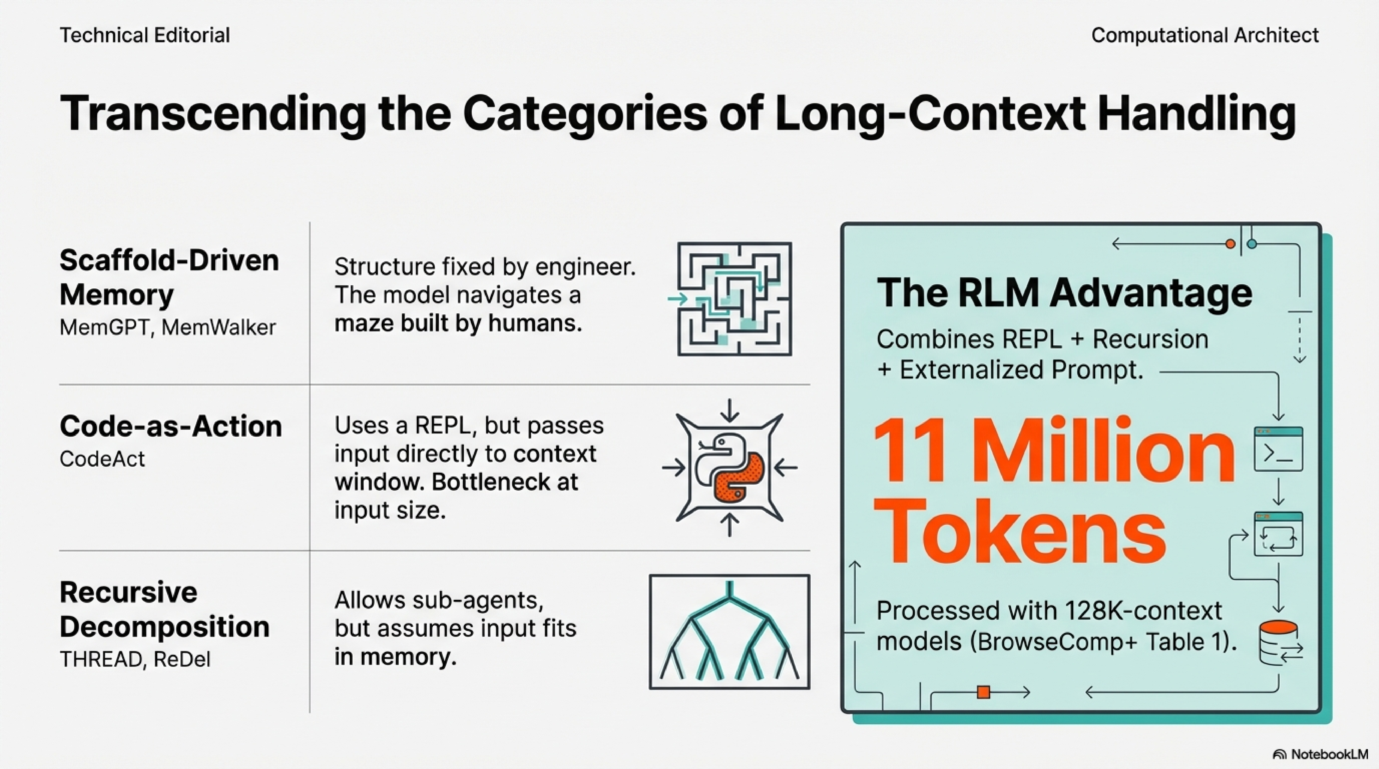 RLMs synthesize these ideas with a novel twist. The prompt is stored as a variable in the REPL environment, not passed to the model’s context window. The model writes code to examine, filter, and chunk this variable, constructing sub-queries and invoking itself recursively. This out-of-core design, inspired by algorithms that process datasets too large for RAM, enables inputs to scale far beyond context limits. In the paper’s BrowseComp+ experiments (Table 1), RLMs process 6-11 million tokens with 128K-context models. Section 3.1 documents emergent patterns: models filter contexts with regex based on priors (Figure 4a), chunk documents and dispatch transformations across chunks (Figure 4b), verify answers through sub-calls before committing, and stitch outputs from hundreds of invocations.