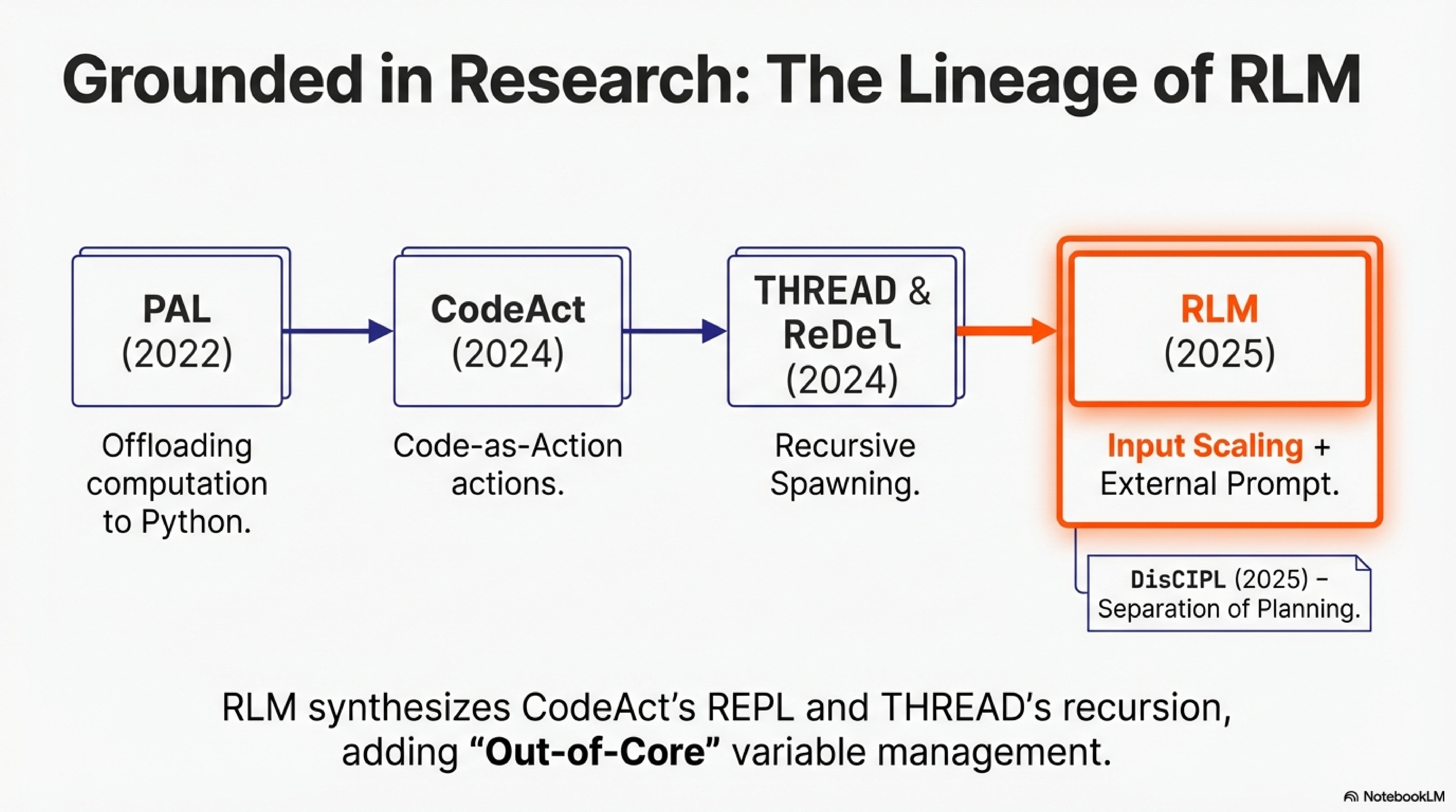 PAL first demonstrated that LLMs could generate programs to offload computation to a Python interpreter. On GSM8K math problems, PAL with Codex outperformed PaLM-540B chain-of-thought by 15% absolute. The interpreter handles computation; the model focuses on decomposition. PAL’s scope is limited to single-program execution without iteration or feedback. RLM extends this with an interactive REPL where the model observes results and adapts.