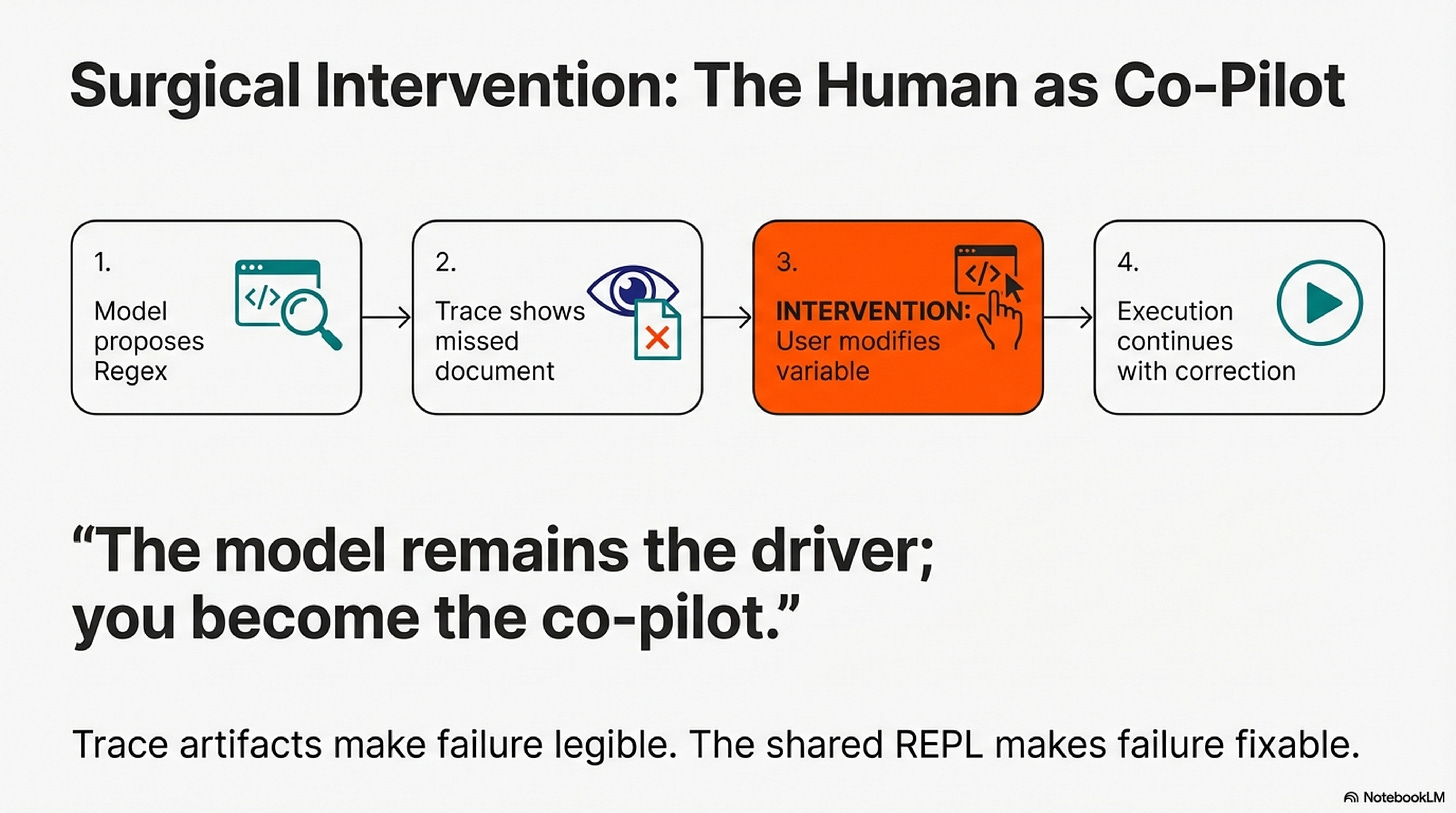 The Jupyter integration provides the answer. Human and model share a REPL. When the trace reveals a mistake, you can intervene: modify a variable, add a document to the filtered set, re-execute from the point of failure. The paradigm becomes collaborative. The model proposes a decomposition; you inspect it; you correct what it got wrong; execution continues with your correction in place.