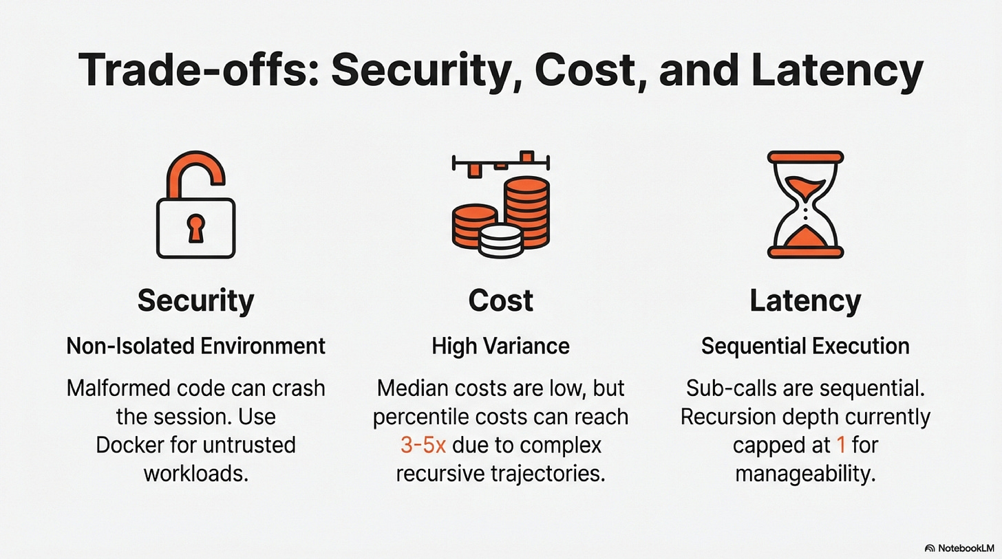Cost variance is real. The paper documents this in Figure 3. Median RLM costs are comparable to base models because the model selectively views context. But 95th percentile costs reach 3-5x the median due to long trajectories on complex tasks. The trace artifacts make these trajectories visible, which may help identify inefficient patterns.